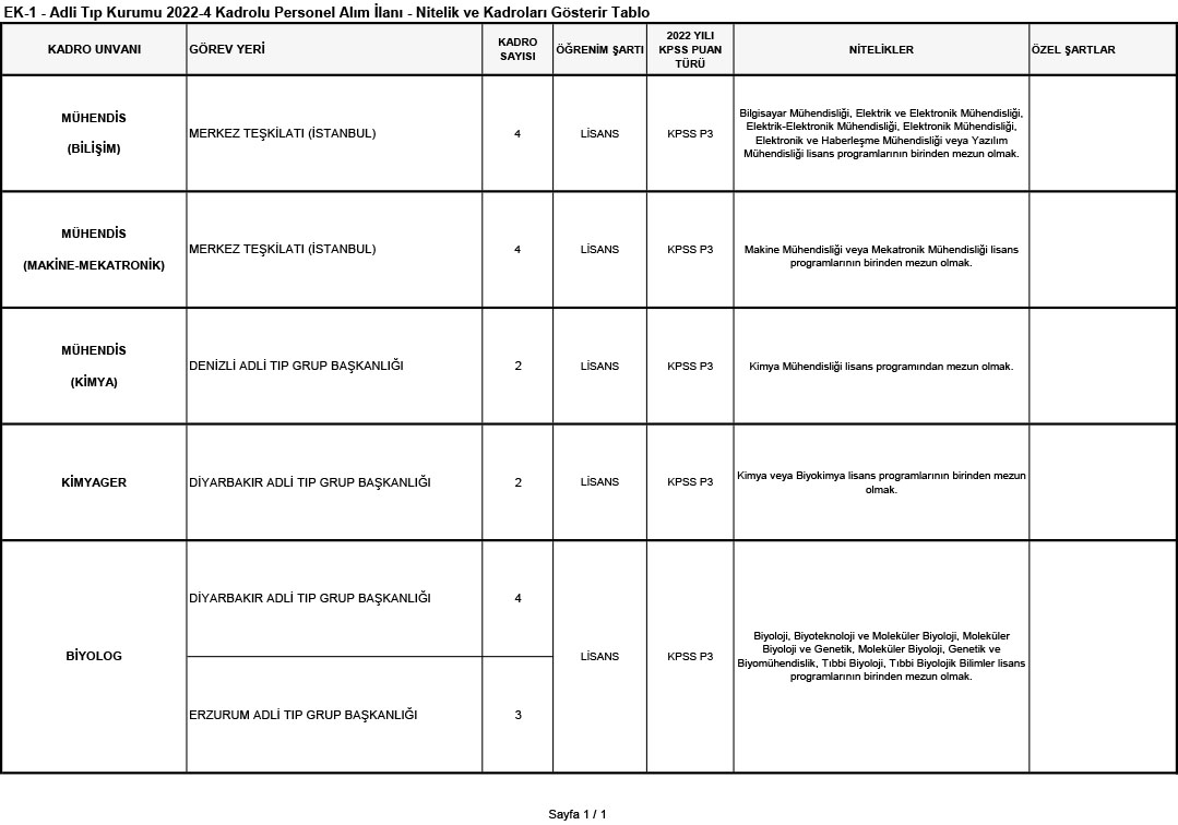 1) Adli Tıp Kurumu Merkez ve Taşra Teşkilatında görev yapmak üzere 657 sayılı Devlet Memurları Kanunu’nun 4/A maddesi uyarınca istihdam edilmek üzere;