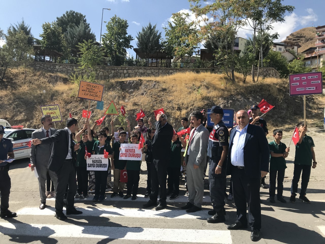 Sadık Polat Ortaokulu önünde bulunan yaya geçidinde öğrencilerin katılımı ile etkinlik düzenlendi.Etkinliğe, İlçe Kaymakamı Adnan Doğan, Belediye Başkanı Vekili Basri Yılmaz, Belediye Başkan Yardımcısı Gürbüz Bulut, İlçe Milli Eğitim Müdürü Sadık Özdemir, ilçe emniyet ile ilçe jandarma komutanlığı yetkilileri, öğretmenler ve öğrenciler katıldı.