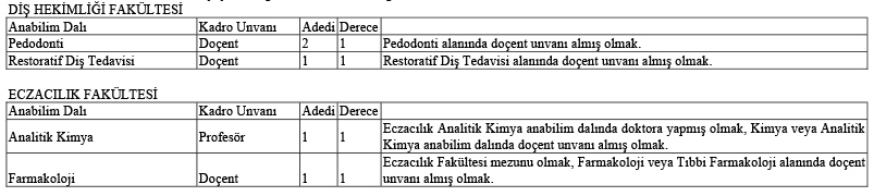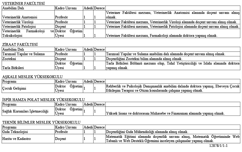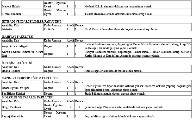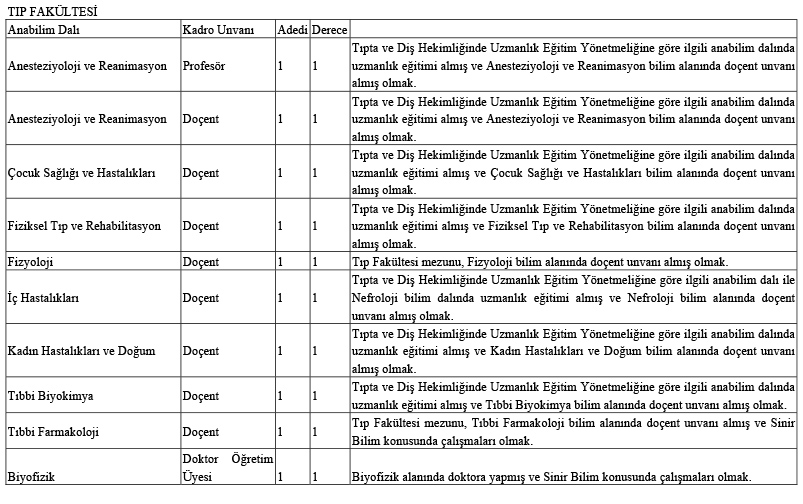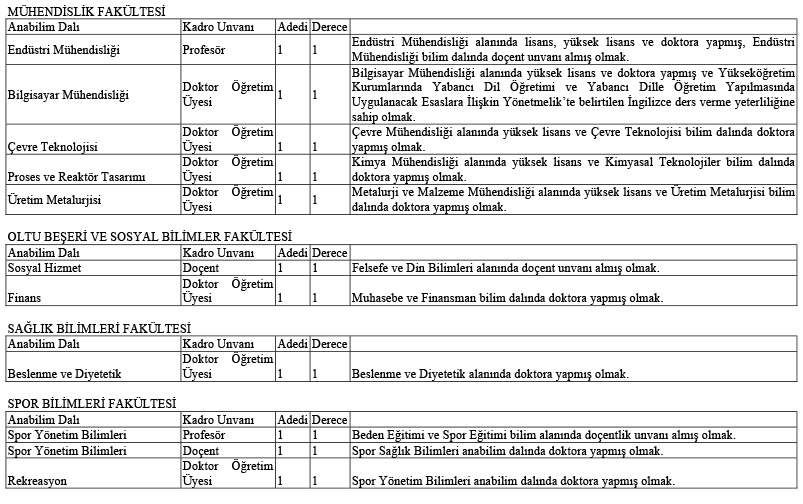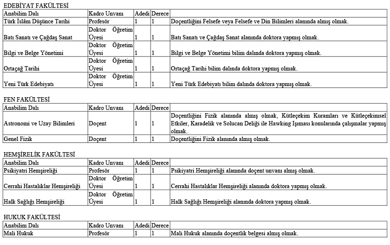 Üniversitemize bağlı birimlerde istihdam edilmek üzere, 2547 sayılı Kanunun ve Üniversitemiz Öğretim Üyeliğine Yükseltilme ve Atanma Yönetmeliğinin ilgili maddelerine göre öğretim üyesi alınacaktır. Müracaat edecek adayların devlet hizmetine girmede aranılan genel şartlara haiz olmaları gerekmektedir. Profesör ve Doçent kadroları daimi statüdedir.