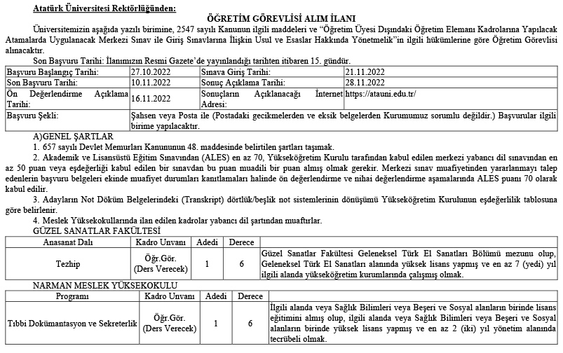 -2547 sayılı Kanun’un ilgili maddesinde belirtilen şartlara haiz adayların, dilekçe (Yabancı dil belirtilecek), özgeçmiş, yayın listesi, nüfus cüzdanı fotokopisi, askerlik belgesi, öğrenim belgeleri (lisans, yüksek lisans, doktora ve uzmanlık belgesi) ve 2 adet fotoğraf içeren 4 takım dijital dosya (4 adet USB/CD/DVD) halinde yayınları ile ilgili birime teslim edeceklerdir. Postadaki gecikmeden kurumumuz sorumlu değildir.