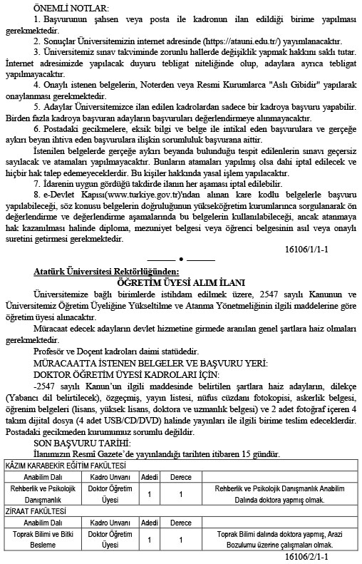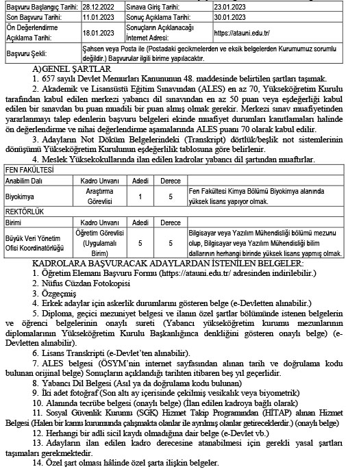 Son Başvuru Tarihi: İlanımızın Resmî Gazete’de yayınlandığı tarihten itibaren 15. gündür.
