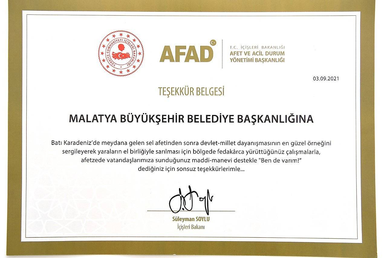 İçişleri Bakanı Süleyman Soylu imzasıyla Malatya Büyükşehir Belediye Başkanlığı'na gönderilen teşekkür belgesinde, "Batı Karadeniz'de meydana gelen sel afetinden sonra devlet millet dayanışmasının en güzel örneğini sergileyerek yaraların el birliğiyle sarılması için bölgede fedakârca yürüttüğünüz çalışmalarla, afetzede vatandaşlarımıza sunduğunuz maddi-manevi destekle 'Ben de varım!' dediğiniz için sonsuz teşekkürlerimizle" ifadelerine yer verildi.