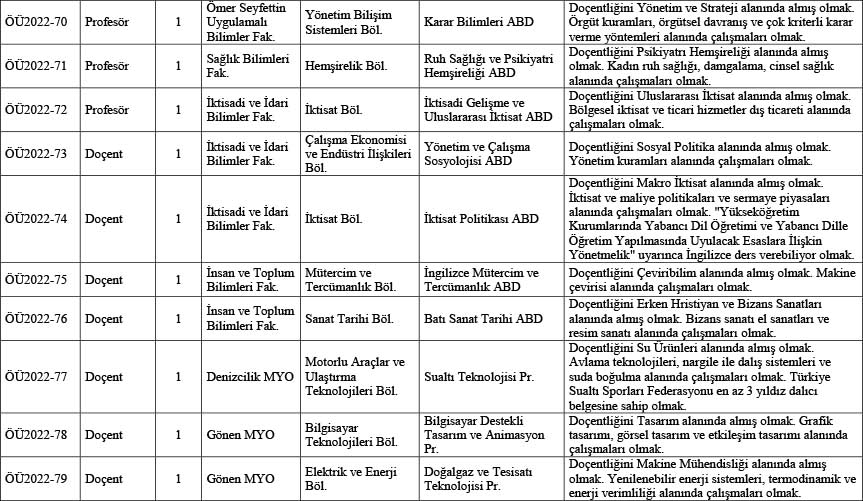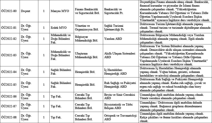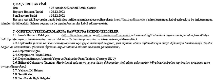 Üniversitemizin aşağıda belirtilen birimlerine 2547 sayılı Kanun’un ve Öğretim Üyeliğine Yükseltilme ve Atanma Yönetmeliği ve Üniversite Senatosunun 31.12.2021 tarihli 2021/26 sayılı toplantısında ve Yükseköğretim Kurulu Genel Kurulunun 01.06.2022 tarihli toplantısında kabul edilerek 01.06.2022 tarihinde yürürlüğe giren Bandırma Onyedi Eylül Üniversitesi Öğretim Üyeliğine Atama ve Yükseltme Kriterleri Yönergesi’nin ilgili maddeleri uyarınca öğretim üyesi alınacaktır.
