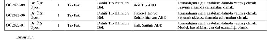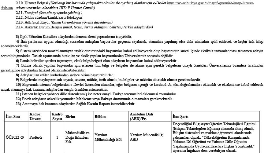 Başvuracak adayların ilgili mevzuatta ve ilanda belirtilen şartları taşımaları gerekmektedir. Ayrıca yurt dışından alınan diplomaların denkliğinin Yükseköğretim Kurulu Başkanlığı/Üniversitelerarası Kurul tarafından onaylanmış olması ve 657 sayılı Kanun’un 48. maddesindeki tüm şartları taşıyor olmaları gerekmektedir.
