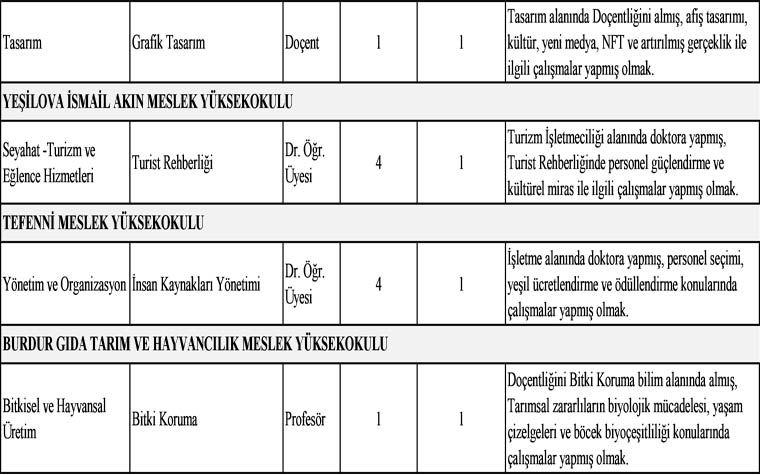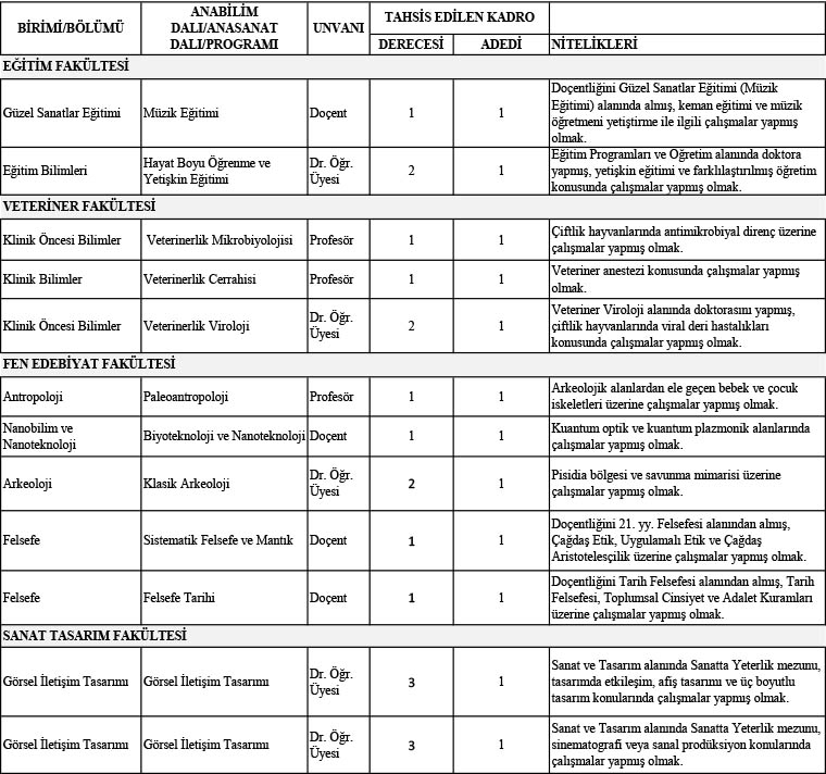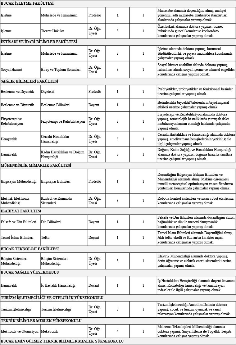 Üniversitemizin çeşitli birimlerine, 2547 Sayılı Kanun, Öğretim Üyeliğine Yükseltilme ve Atama Yönetmeliğinin ilgili maddeleri ve Burdur Mehmet Akif Ersoy Üniversitesi Öğretim Üyeliği Kadrolarına Başvuru Koşulları ve Uygulama İlkeleri Hakkında Yönergesine göre aşağıda belirtilen bölüm ve anabilim dallarına öğretim üyesi alınacaktır.