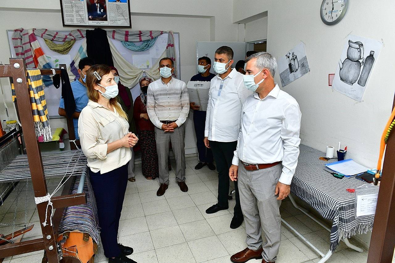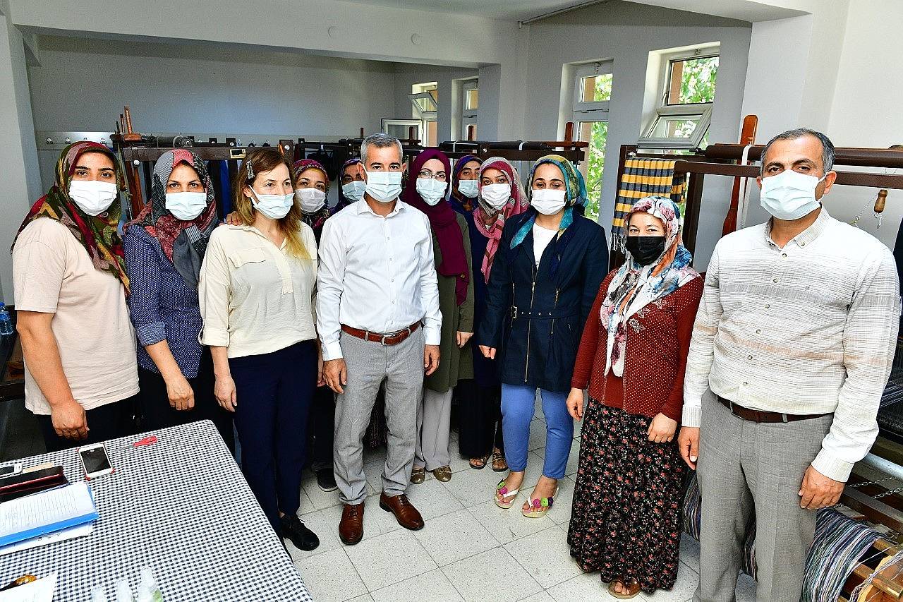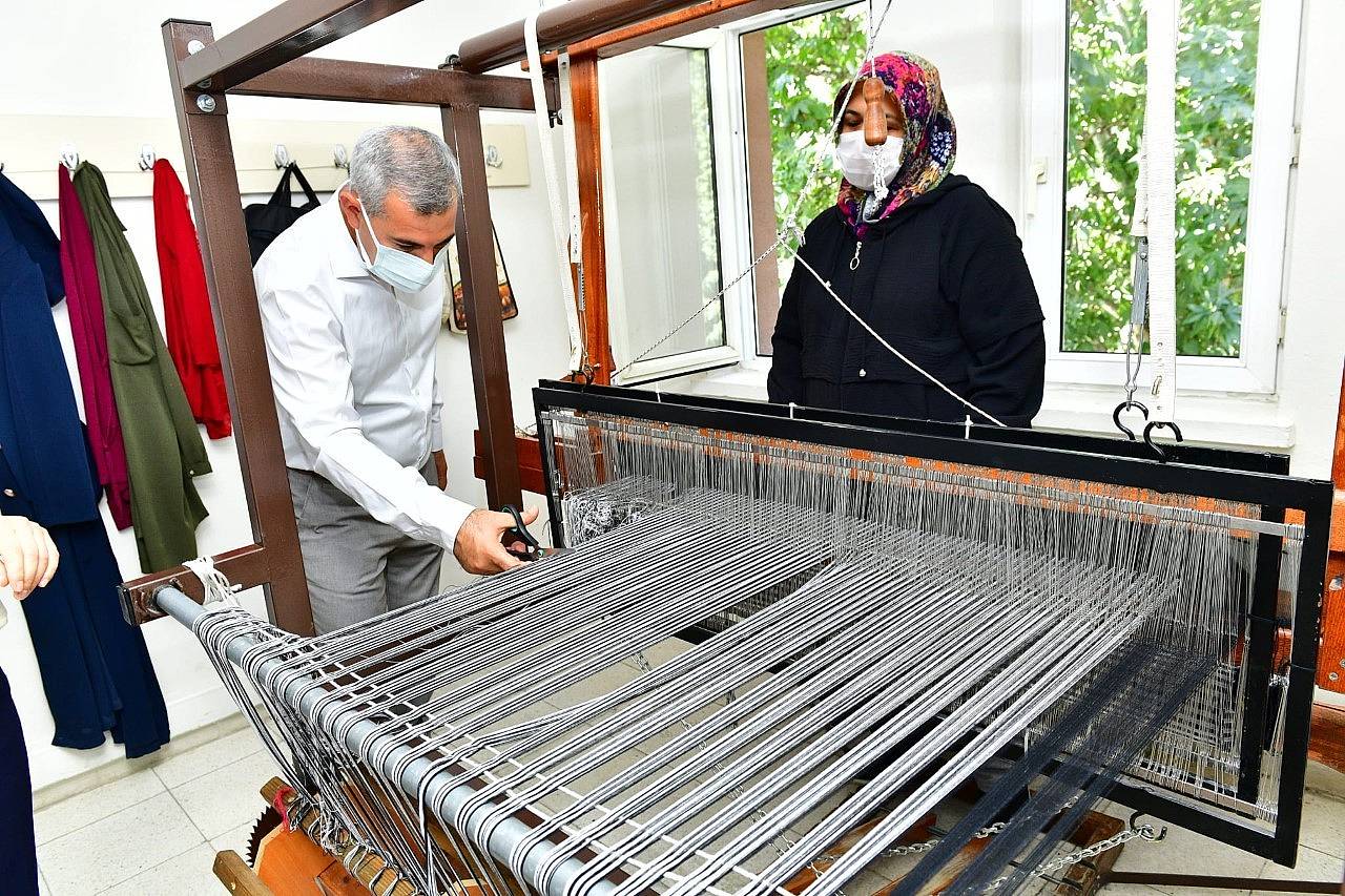 Kurs öğretmenlerinden verilen eğitimler hakkında detaylı bilgiler alan Çınar, Halı Dokuma kursunda dokunan bir halının ilk kesimini yaptı.
