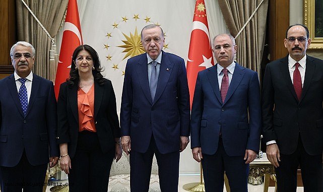 "DEM Parti İmralı Heyeti üyelerimiz Pervin Buldan ve Mithat Sancar, bugün Sayın Cumhurbaşkanı Recep Tayyip Erdoğan'la Beştepe'de görüştü. Heyetimiz, sürecin geldiği yeni aşama ve bundan sonra yapılacaklar konusunda görüş ve önerilerini aktardı. Görüşmede, sürecin ilerlemesi konusunda karşılıklı iradenin devam ettiği vurgulandı."