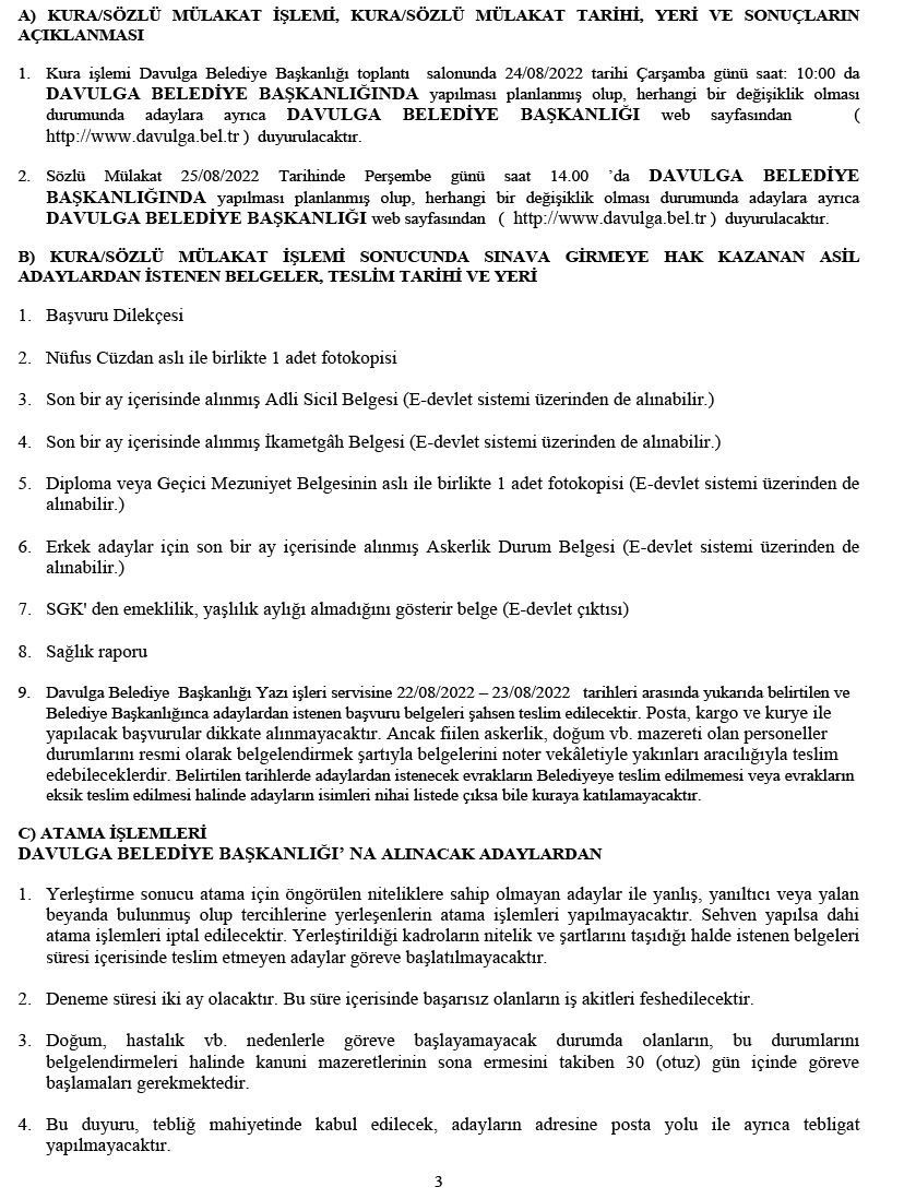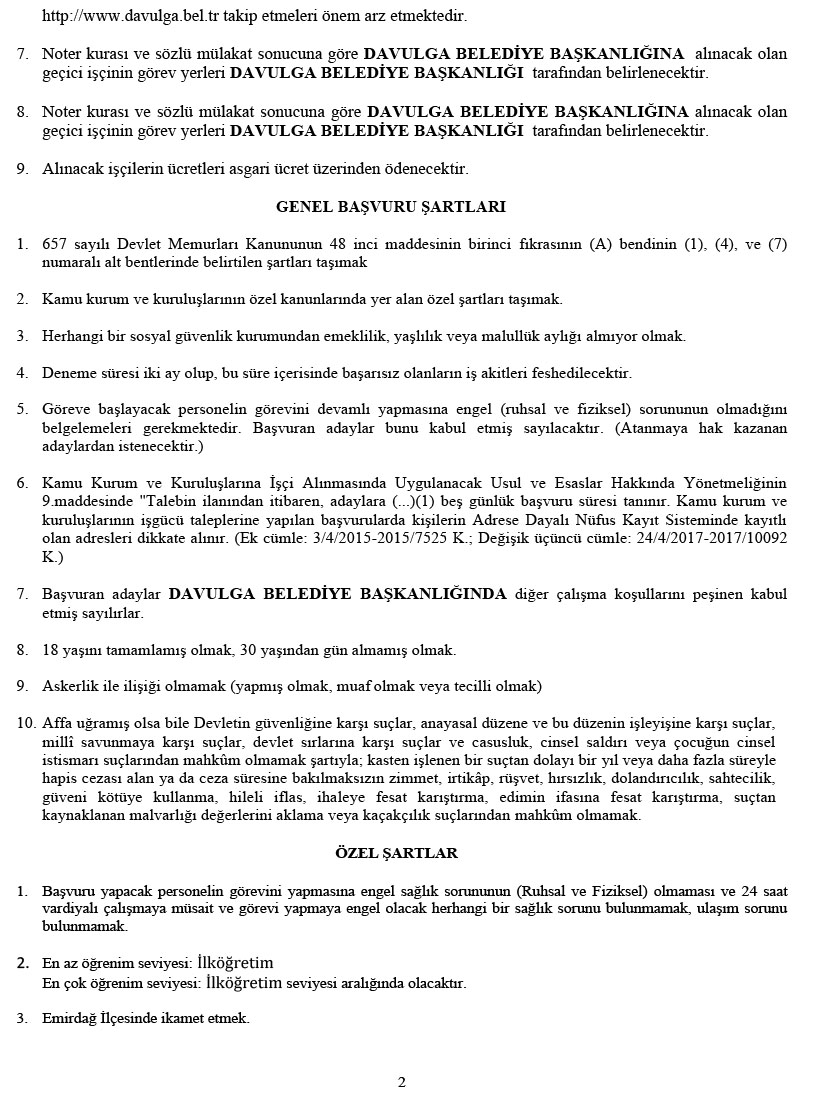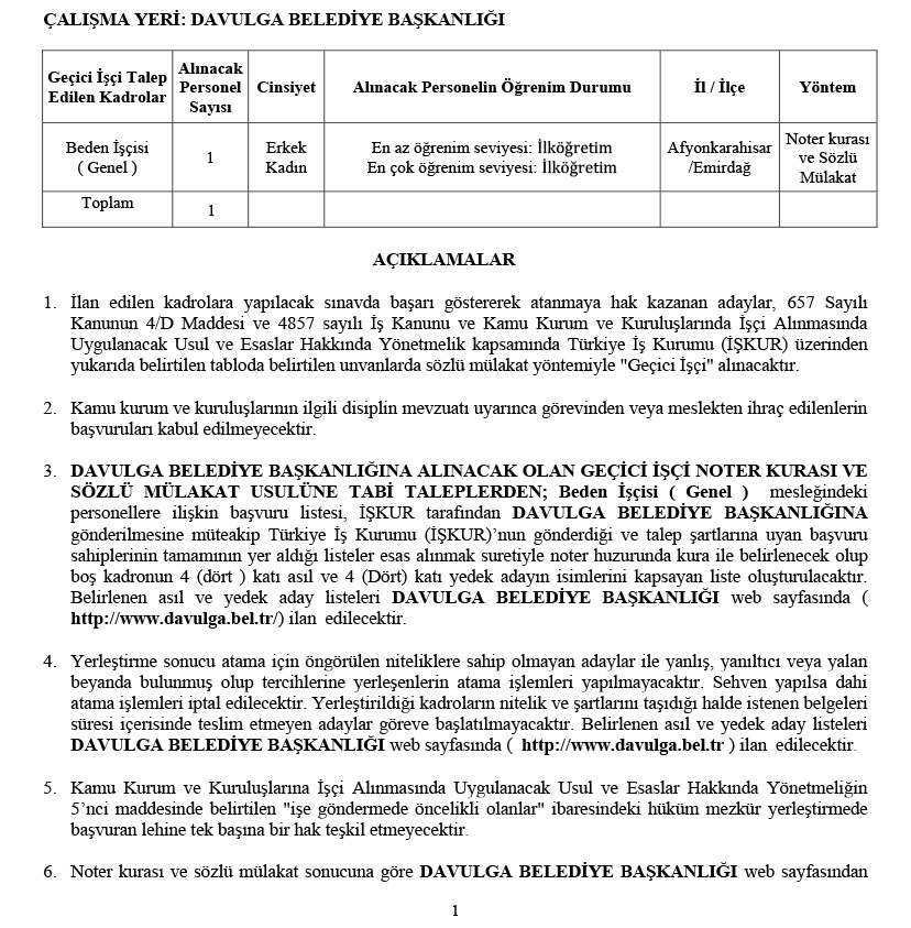 DAVULGA BELEDİYE BAŞKANLIĞI ve bağlı birimlerde istihdam edilmek üzere 657 sayılı Devlet Memurları Kanunun 4/d maddesi ve 4857 sayılı İş Kanunu ve ilgili yönetmelik hükümleri kapsamında Türkiye İş Kurumu (İŞKUR) üzerinden geçici işçi alınacaktır. Aranan şartlar ve sayılar aşağıda belirtilmiştir.
