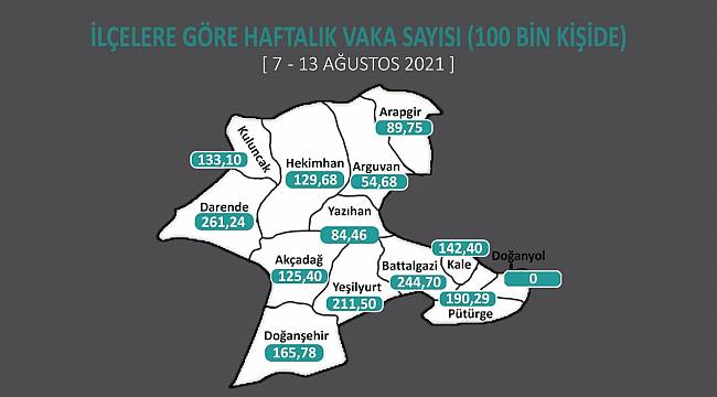 Sağlık Bakanlığı tarafından yayımlanan 7-13 Ağustos tarihleri arasındaki ilçelerdeki haftalık vaka sayısına göre, 100 bin kişide 261,24 ile Darende ilçesi en fazla vaka görülen ilçe oldu. Darende'yi 244,70 ile Battalgazi ve 211,50 ile Yeşilyurt ilçeleri takip etti.