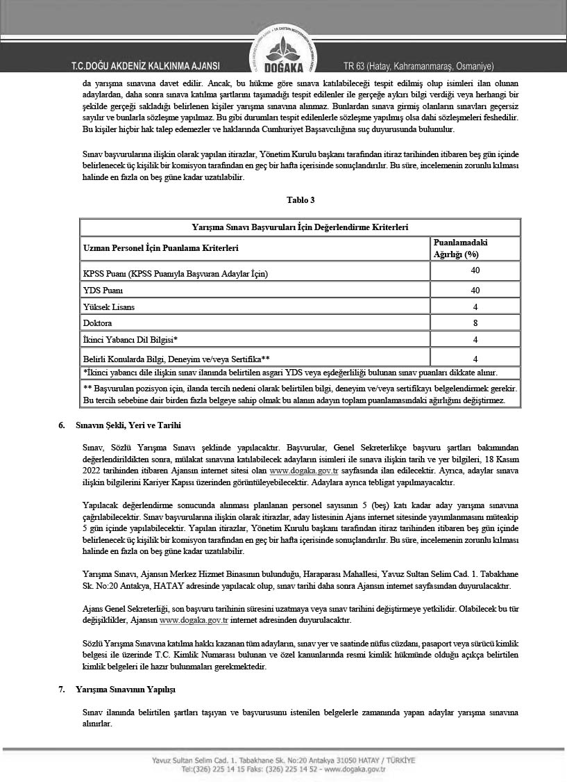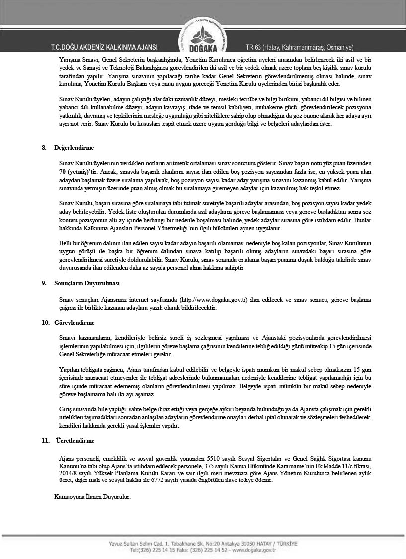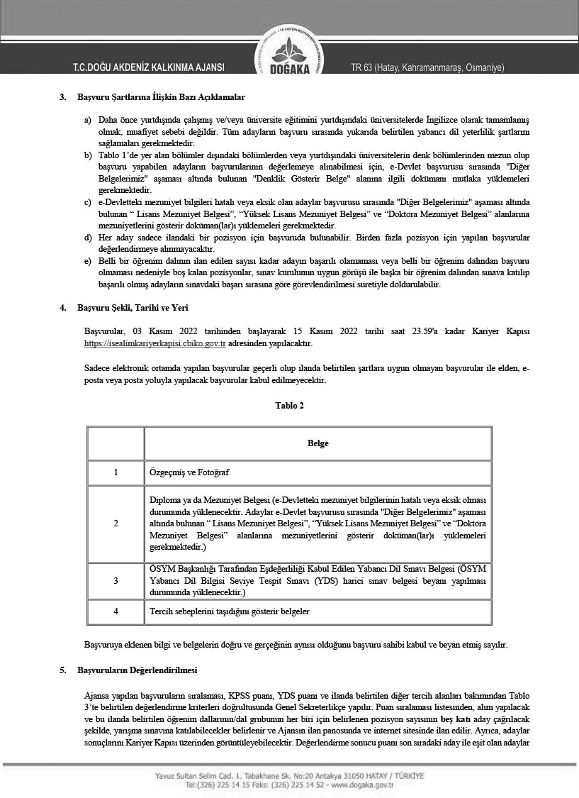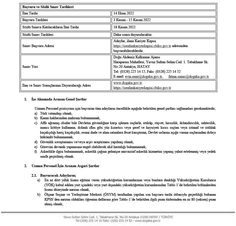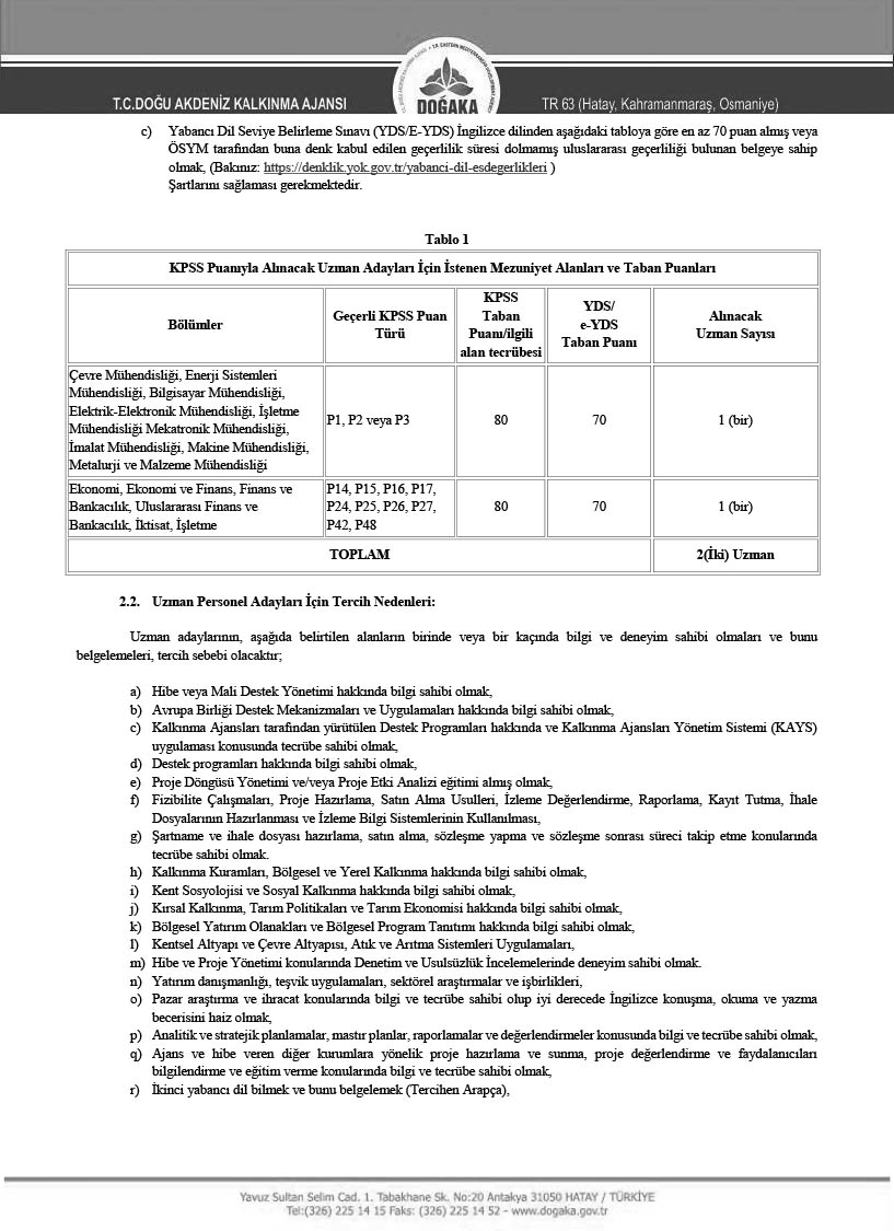 Doğu Akdeniz Kalkınma Ajansı, 15/7/2018 tarihli ve 30479 sayılı Resmi Gazete’de yayımlanan 4 sayılı Bakanlıklara Bağlı, İlgili, İlişkili Kurum ve Kuruluşlar İle Diğer Kurum ve Kuruluşların Teşkilatı Hakkında Cumhurbaşkanlığı Kararnamesinin 187 nci maddesinin ikinci fıkrasının (g) bendi ve 200 üncü maddesi ile 27/6/1989 tarihli ve 375 sayılı Kanun Hükmünde Kararnamenin Ek 28 inci maddesinin dördüncü fıkrası hükümlerine dayanılarak hazırlanan ve 29 Mayıs 2019 tarihli ve 30788 sayılı Resmi Gazete’de yayımlanan Kalkınma Ajansları Personel Yönetmeliği hükümleri çerçevesinde, TR63 Bölgesinin (Hatay, Kahramanmaraş, Osmaniye illeri) kalkınmasına ve gelişmesine hizmet etmek ve katkıda bulunmak isteyen, yeniliğe ve gelişime açık, analitik düşünebilen, değişen çalışma koşullarına uyum sağlayabilen, hizmet ve kalkınma bilinciyle ve sorumluluğuyla hareket eden, seyahat engeli olmayan 2 Uzman Personel alımı gerçekleştirecektir.