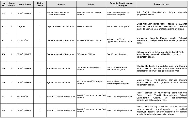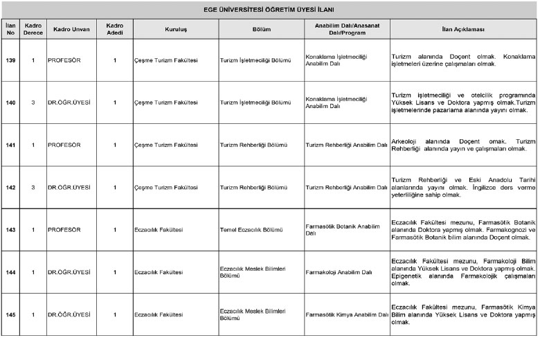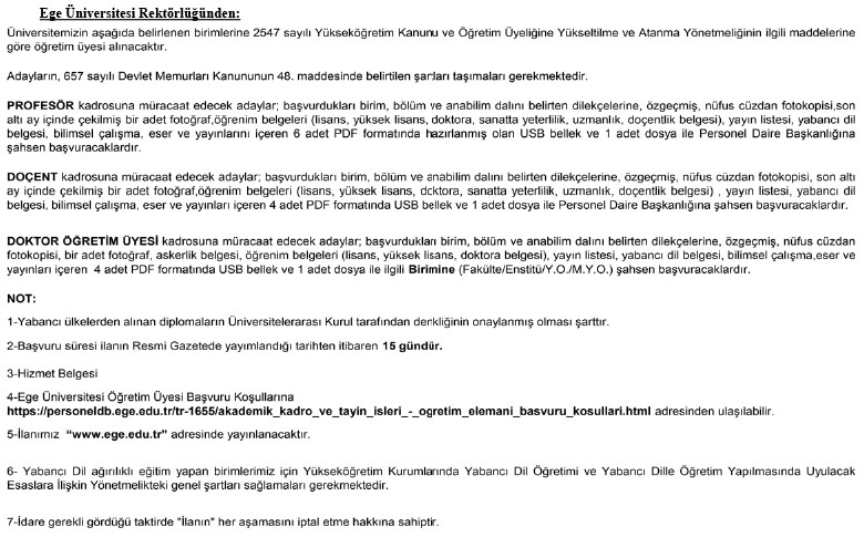 Eleman İlanı Yayınlanma: 01 Kasım 2022 - 11:56 Ege Üniversitesi 113 Öğretim Üyesi Alımı 2022 Ege Üniversitesi 113 Öğretim Üyesi Alımı Yapacağını Duyurdu. Yapılan Duyuru Şöyle; Eleman İlanı 01 Kasım 2022 - 11:56 Yorumlar TAKİP ET Dinle Yazdır A Büyüt A Küçült Yorumlar Ege Üniversitesi 113 Öğretim Üyesi Alımı Yapacağını Duyurdu. Yapılan Duyuru Şöyle; Resmi İlan Metni için tıklayınız YORUMLAR FACEBOOK adlı kullanıcıya cevap x Gönder İlginizi Çekebilir Devlet Demir Yolları İşletmesi Genel Müdürlüğü 57 Sürekli İşçi Alımı 2025 Malatya Esenlik Personel Alımı Yapacak 2025 İnönü Üniversitesi Öğretim Elemanı Alımı 2024 İnönü Üniversitesi Öğretim Üyesi Alımı 2024 ilan.gov.tr Son Haberler Malatya'da kaza sonrası kavga: 2 yaralı Yeşilyurt Belediyesi 300 bin adet fide dağıtımı yapacak 18 Nisan 2026 Malatya'da Vefat Edenler Parasını alamayınca eylem için inşaata çıkan işçiyi polis ikna... Malatya'da iki araç çarpıştı: 4 yaralı Çok Okunan Haberler Malatya'da gölette boğulan şahsın kimliği belirlendi Malatya'da eski eşinin komşuları tarafından darbedilen şahıs hastanelik... Darende'de yarım asırlık bayramlaşma geleneği Başkan Çınar; Oluklu Mahallemiz Yeni Yatırımlarımızla Gelişiyor ve Güzelleşiyor Başkan Çınar; Oluklu Mahallemiz Yeni Yatırımlarımızla Gelişiyor ve Güzelleşiyor