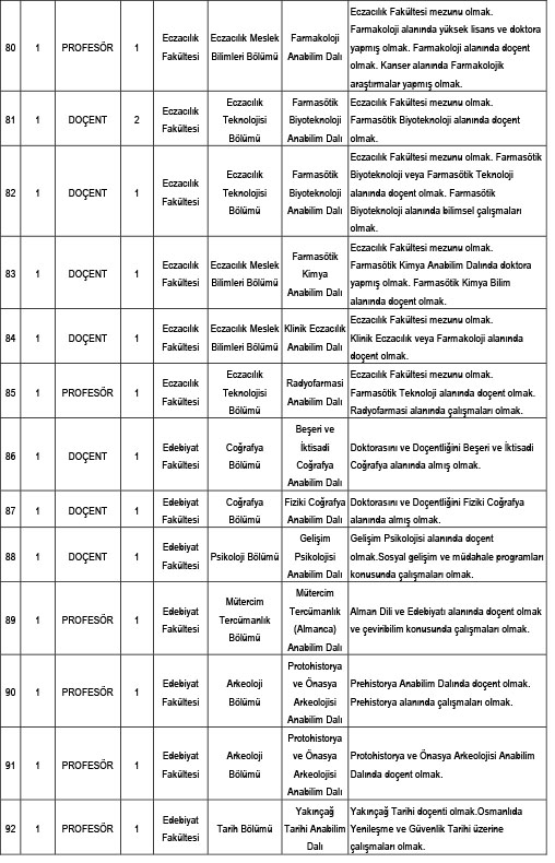 PROFESÖR kadrosuna müracaat edecek adaylar; başvurdukları birim, bölüm ve anabilim dalını belirten dilekçelerine, özgeçmiş, nüfus cüzdan fotokopisi, son altı ay içinde çekilmiş bir adet fotoğraf, öğrenim belgeleri (lisans, yüksek lisans, doktora, sanatta yeterlilik, uzmanlık, doçentlik belgesi), yayın listesi, yabancı dil belgesi, bilimsel çalışma, eser ve yayınlarını içeren 6 adet PDF formatında hazırlanmış olan USB bellek ve 1 adet dosya ile Personel Daire Başkanlığına şahsen başvuracaklardır.