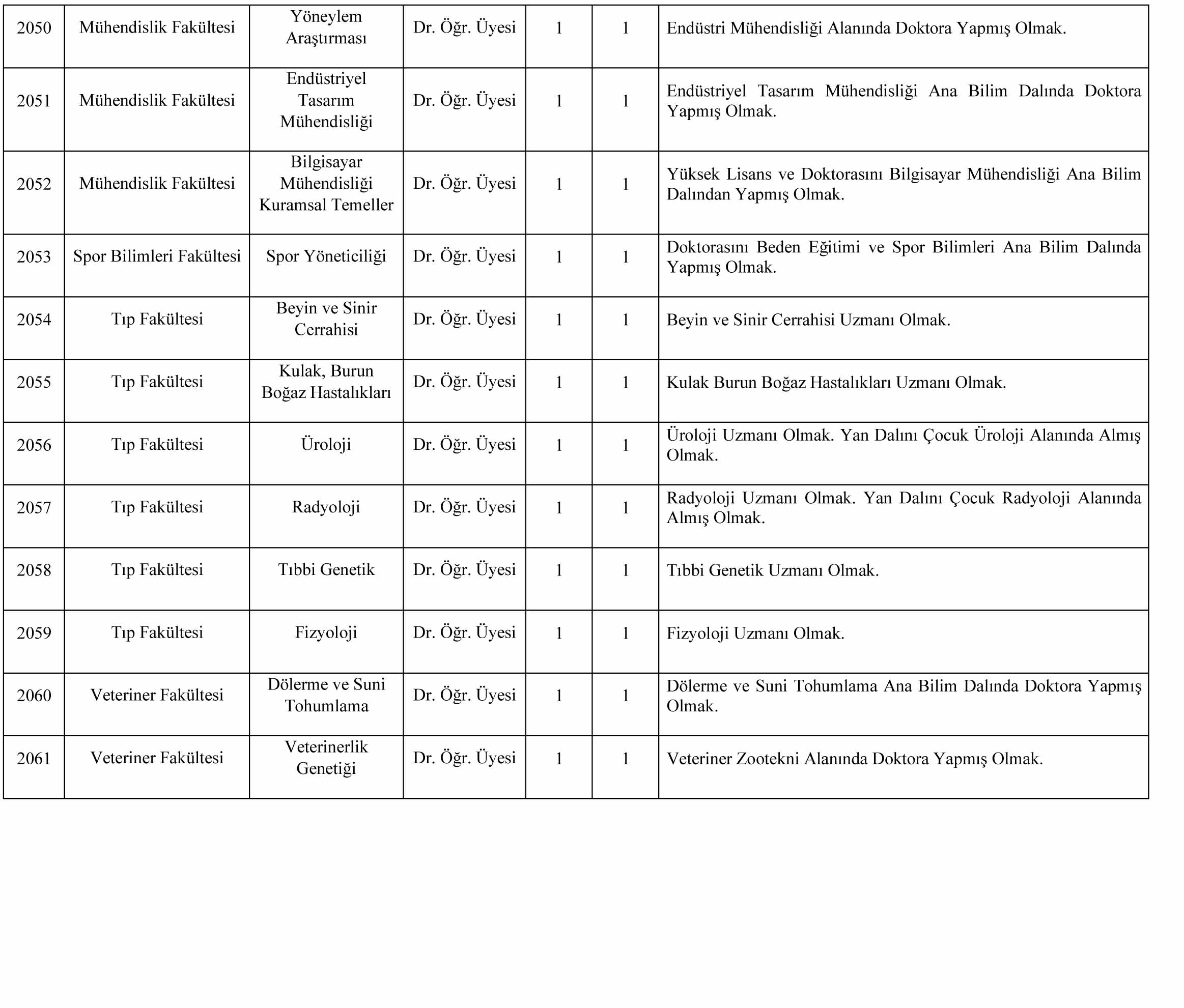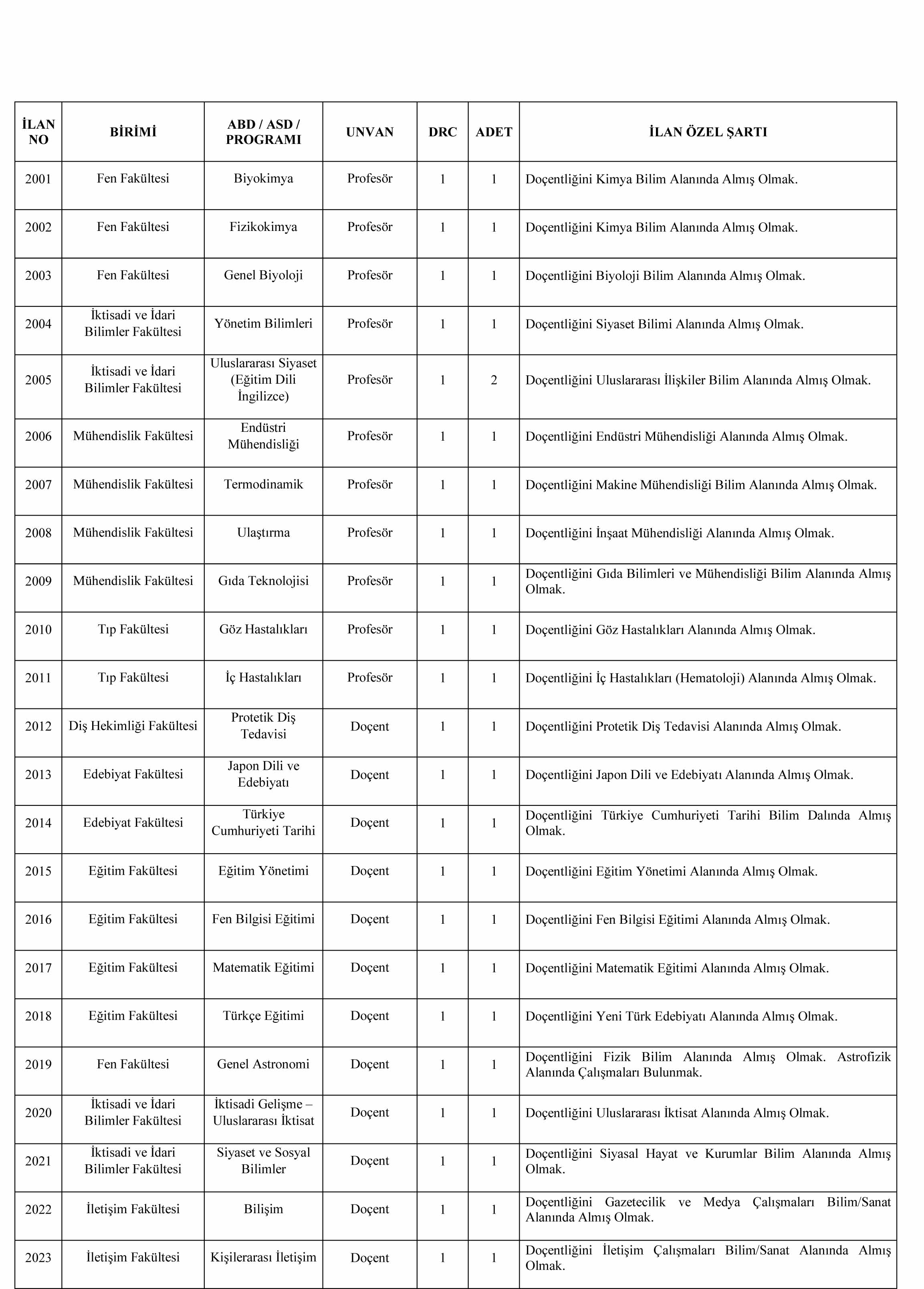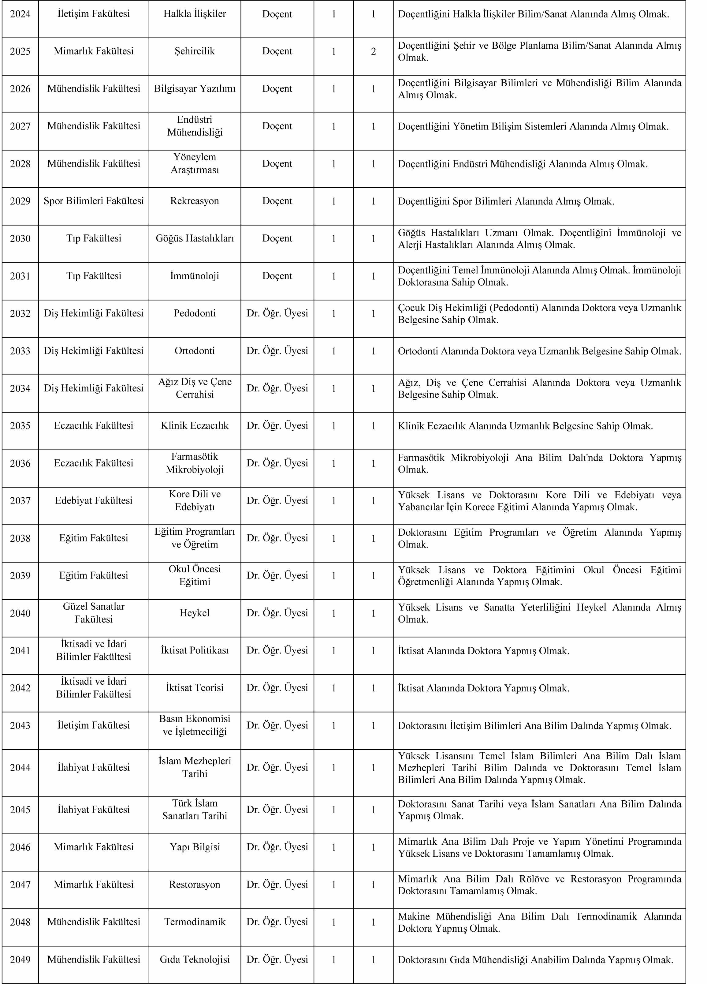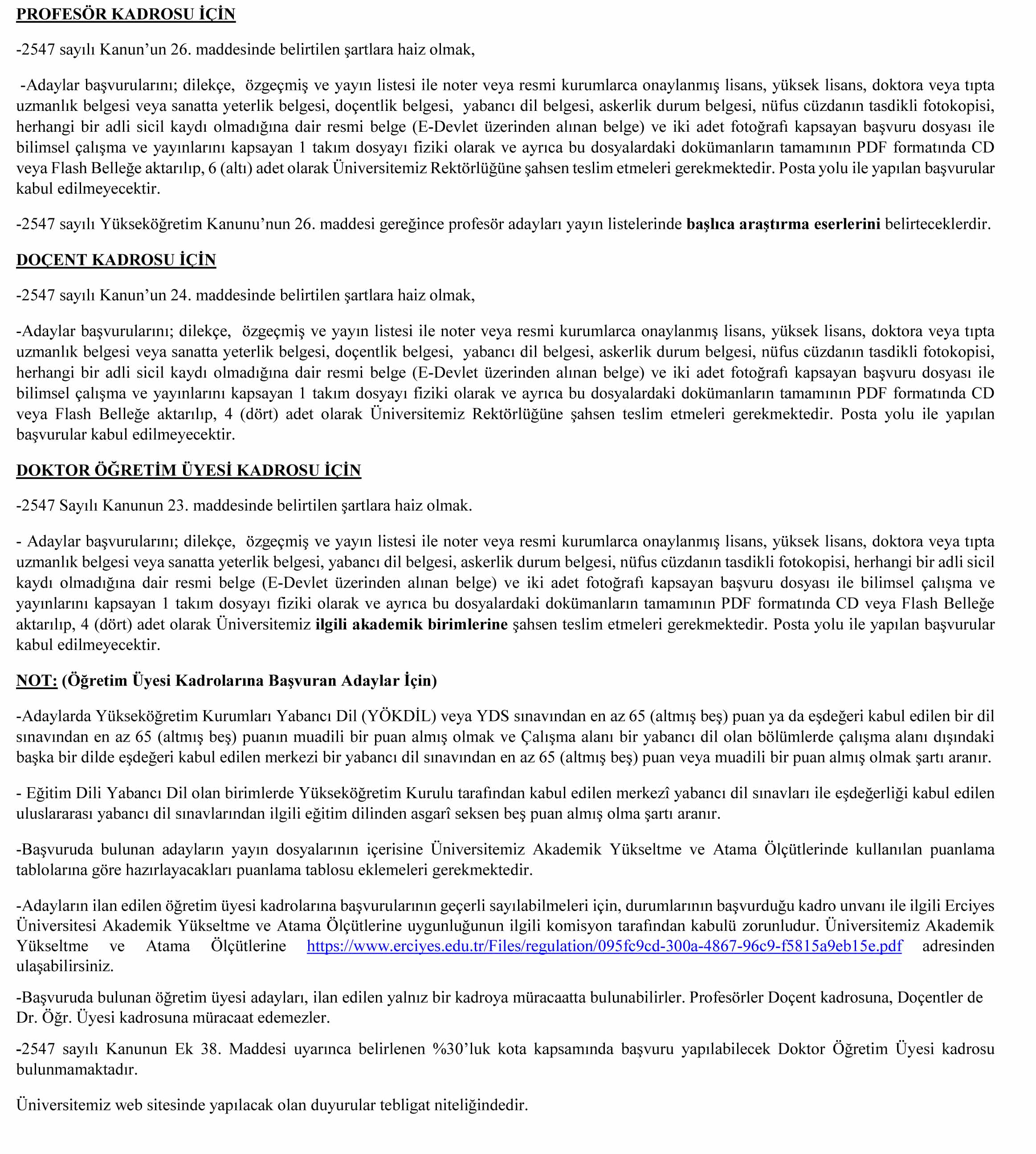 Üniversitemizin aşağıda belirtilen birimlerine; 657 Sayılı Devlet Memurları Kanunu’nun 48. Maddesi, 2547 sayılı Yükseköğretim Kanunu ve bu kanuna dayalı olarak çıkartılan ilgili yönetmelik hükümleri ile Erciyes Üniversitesi Akademik Yükseltme ve Atama Ölçütleri doğrultusunda öğretim üyesi alınacaktır. Öğretim Üyeliğine başvuru süresi, ilanın Resmi Gazete’de yayımlandığı tarihten itibaren başlar 15. günün mesai saati bitiminde sona erer. İlan olunur.