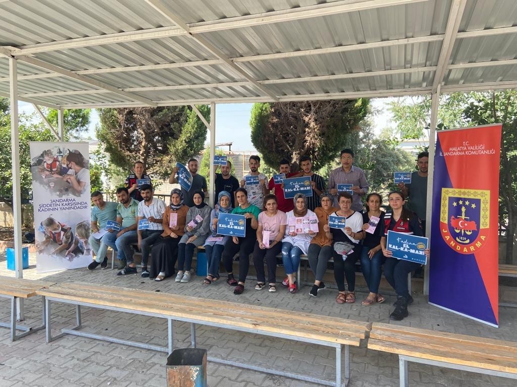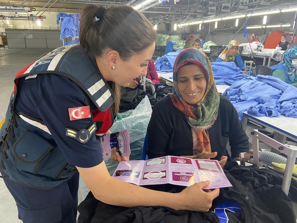 Malatya İl Jandarma Komutanlığı görevlileri, Kadın Destek Uygulaması (KADES) konusunda fabrikada çalışanlara bilgilendirme faaliyetlerini sürdürüyor.