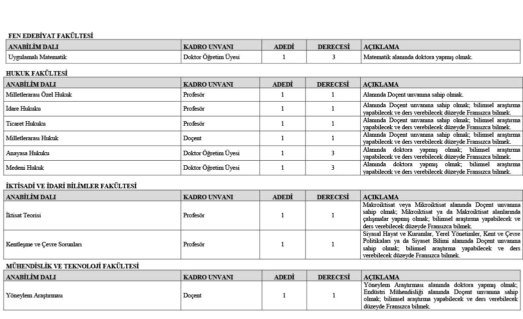 2547 sayılı Yükseköğretim Kanunu’nun ilgili maddeleri uyarınca Üniversitemizin çeşitli birimlerindeki aşağıda unvanları gösterilen kadrolara öğretim üyesi alınacaktır. Adayların 657 sayılı Devlet Memurları Kanunu’nun 48. maddesindeki genel şartları ve “Galatasaray Üniversitesi Öğretim Üyeliğine Yükseltme ve Atama Yönergesi”nde belirtilen şartları haiz olmaları gerekmektedir.