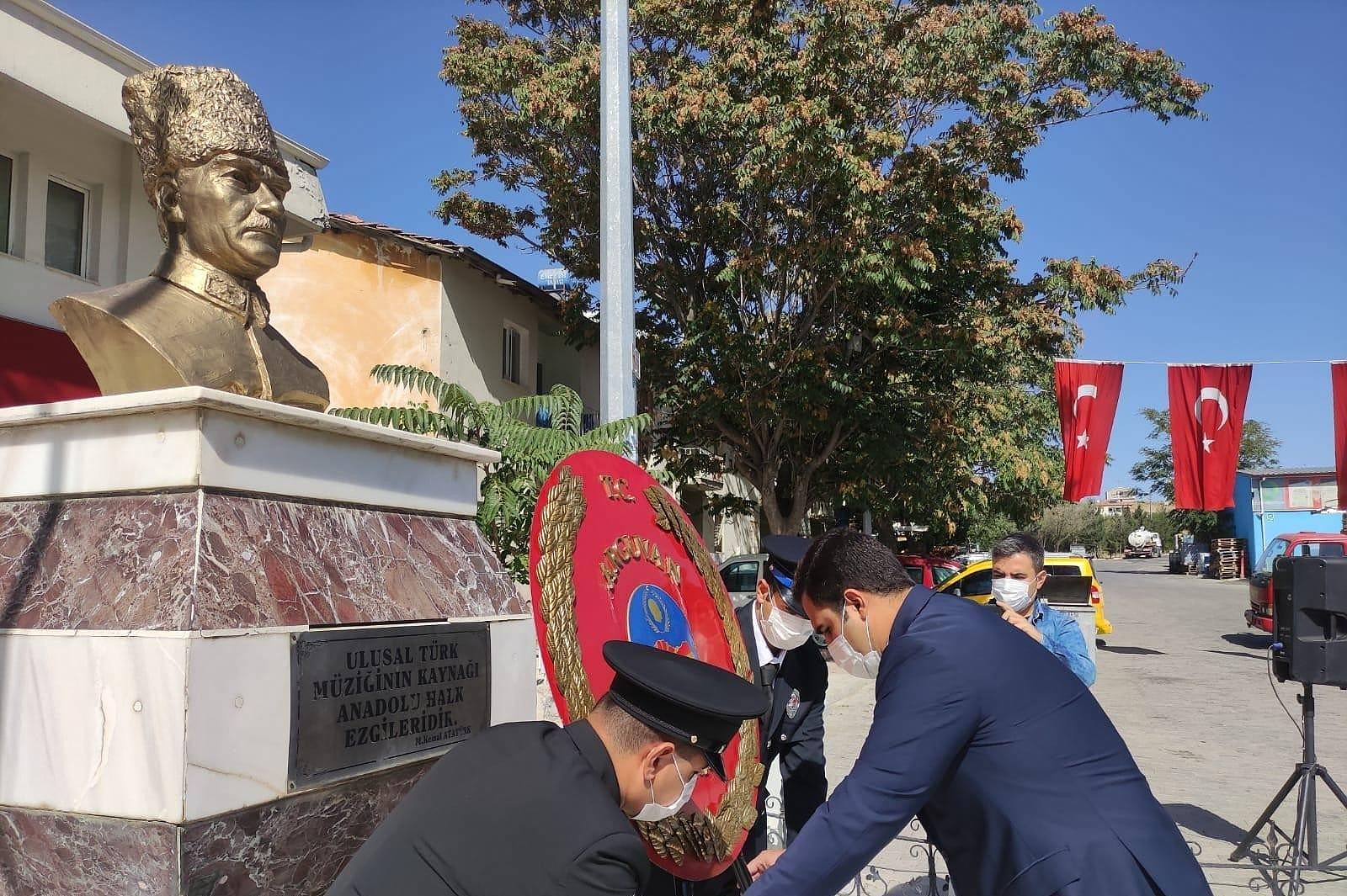 Nazim Hikmet Meydanı'nda Atatürk Anıtı'na İlçe Kaymakamı Kemal Ülkü Belediye Başkanı Mehmet Kızıldaş tarafında çelenk sunumuyla başlayan tören, saygı duruşu ve İstiklal Marşı'nın okunmasıyla devam etti.
