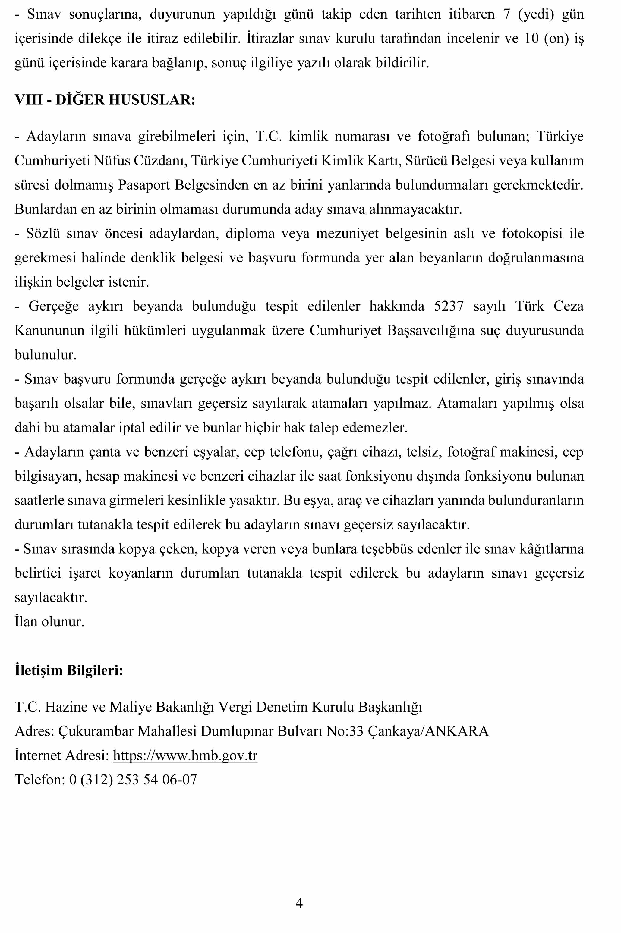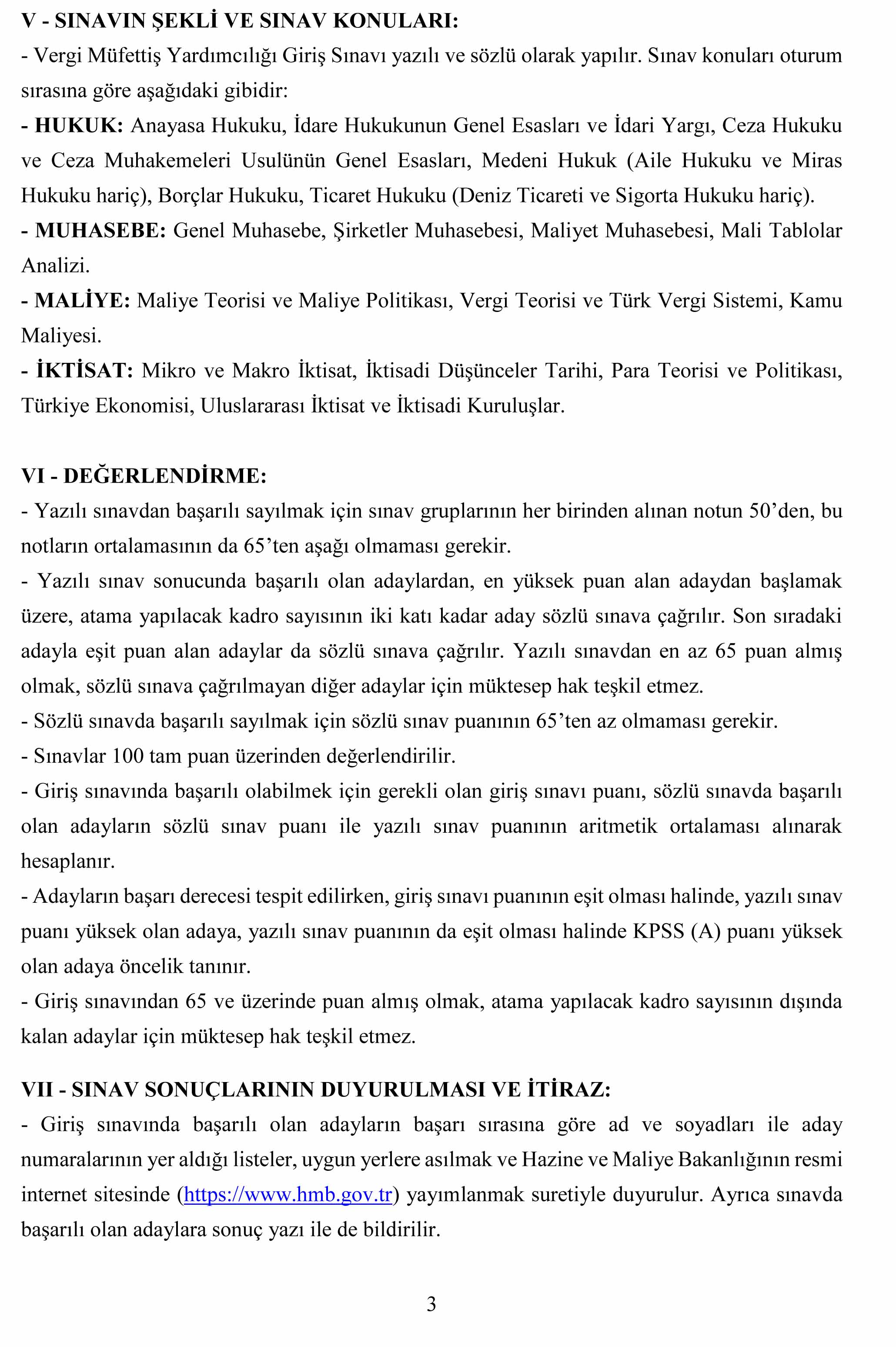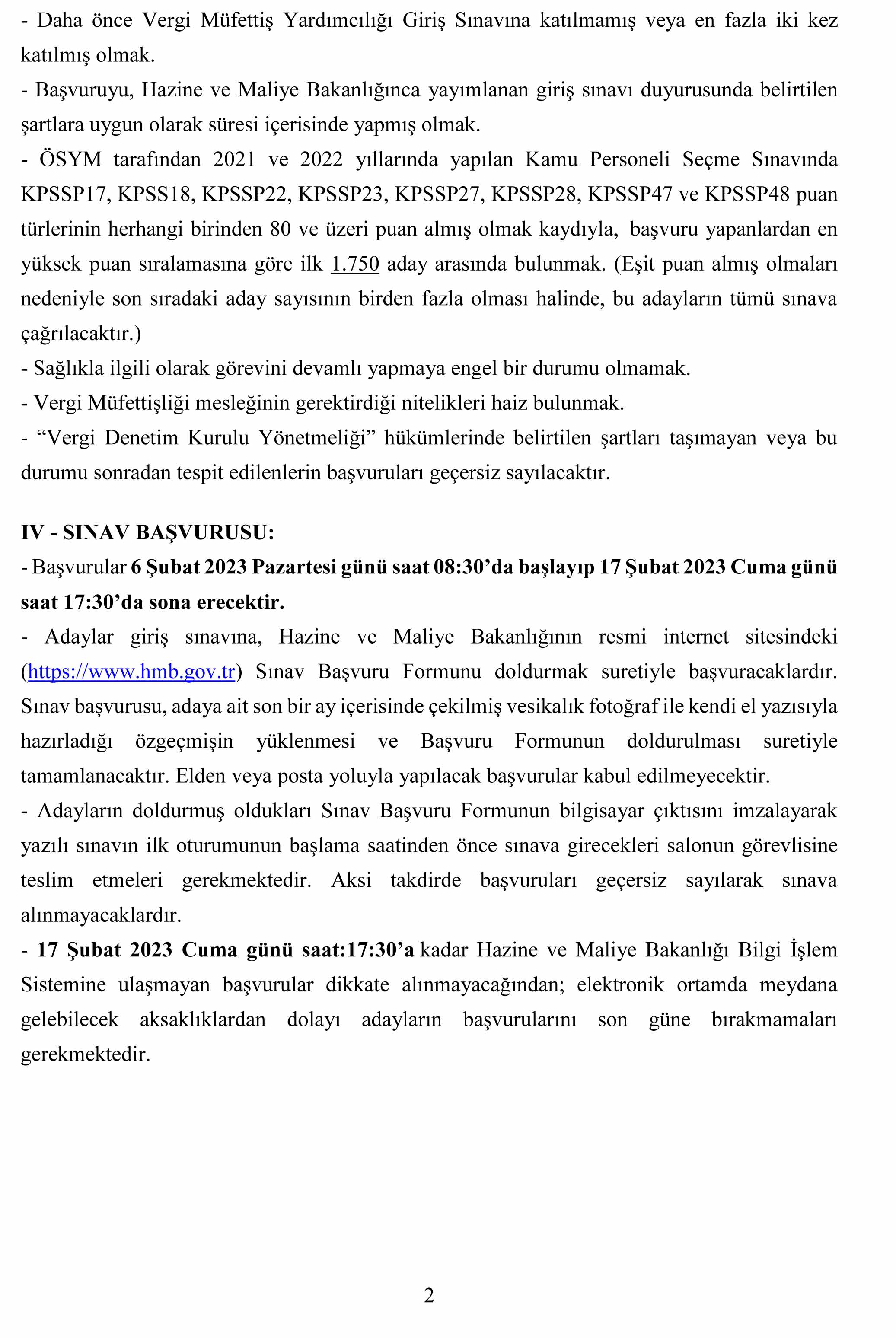 I - SINAVA İLİŞKİN BİLGİLER: - Sınavı Açan Birim: Hazine ve Maliye Bakanlığı Vergi Denetim Kurulu Başkanlığı - Atama Yapılacak Kadro Unvanı ve Sayısı: Vergi Müfettiş Yardımcısı, 350 - KPSS Puan Yılı, Türleri ve Taban Puan: ÖSYM tarafından (A) grubu kadrolar için 2021 ve 2022 yıllarında yapılan Kamu Personeli Seçme Sınavının; KPSSP17, KPSSP18, KPSSP22, KPSSP23, KPSSP27, KPSSP28, KPSSP47 ve KPSSP48 puan türlerinin herhangi birinden 80 ve üzeri puan alanlar. - Yazılı ve Sözlü Sınav Esası: Giriş sınavı önce klasik usulde yazılı, ardından sözlü olmak üzere iki aşamalı yapılır. Yazılı sınavda başarılı olamayanlar sözlü sınava giremezler RESMİ İLAN METNİ İÇİN TIKLAYINIZ II - SINAV TARİHİ VE YERİ: - Giriş sınavının yazılı bölümü 18-19 Mart 2023 (Cumartesi ve Pazar Günleri) tarihlerinde Ankara'da sabah ve öğleden sonra olmak üzere toplam dört oturum halinde yapılacaktır. - Giriş sınavının yazılı bölümüne katılmaya hak kazanan adaylar ile yazılı sınavın yapılacağı yer ve sınav saatleri; Hazine ve Maliye Bakanlığı resmi internet sitesinde (https://www.hmb.gov.tr) yazılı sınavdan en az 10 (on) gün önce ilan edilecektir. Ayrıca, sınava girecek olan adaylar için https://sinav.hmb.gov.tr/ internet sitesi üzerinden sınava giriş belgesi düzenlenecektir. Sınava katılabilmek için bu belgenin ibrazı şarttır. - Sınav tarihi ve/veya yerinin değiştirilmesi halinde durum, Hazine ve Maliye Bakanlığının resmi internet sitesinde (https://www.hmb.gov.tr) ilan edilecek olup, bu ilan tebligat hükmündedir. Adaylara ayrıca tebligat yapılmayacaktır. - Yazılı sınavda başarılı olan adaylar Ankara’da sözlü sınava tabi tutulacak olup sözlü sınava girmeye hak kazanan adayların isimleri ve aday numaraları, sözlü sınav yeri ve tarihinin yer aldığı listeler, uygun yerlere asılmak ve Hazine ve Maliye Bakanlığının resmi internet sitesinde (https://www.hmb.gov.tr) yayımlanmak suretiyle duyurulacaktır. III - SINAVA BAŞVURU ŞARTLARI: - 657 sayılı Devlet Memurları Kanunu'nun 48 inci maddesinde yazılı nitelikleri haiz olmak. - Yazılı sınavın yapıldığı yılın ocak ayının birinci günü itibarıyla 35 yaşını doldurmamış olmak. (01.01.1988 tarihinde veya bu tarihten sonra doğmuş olmak) - Erkek adaylar için askerlikle ilişiği olmamak. - En az dört yıllık yükseköğretim veren hukuk, siyasal bilgiler, iktisat, işletme, iktisadi ve idari bilimler fakülteleri ile bunlara denkliği Yükseköğretim Kurulunca kabul edilmiş yükseköğretim kurumlarından mezun olmak