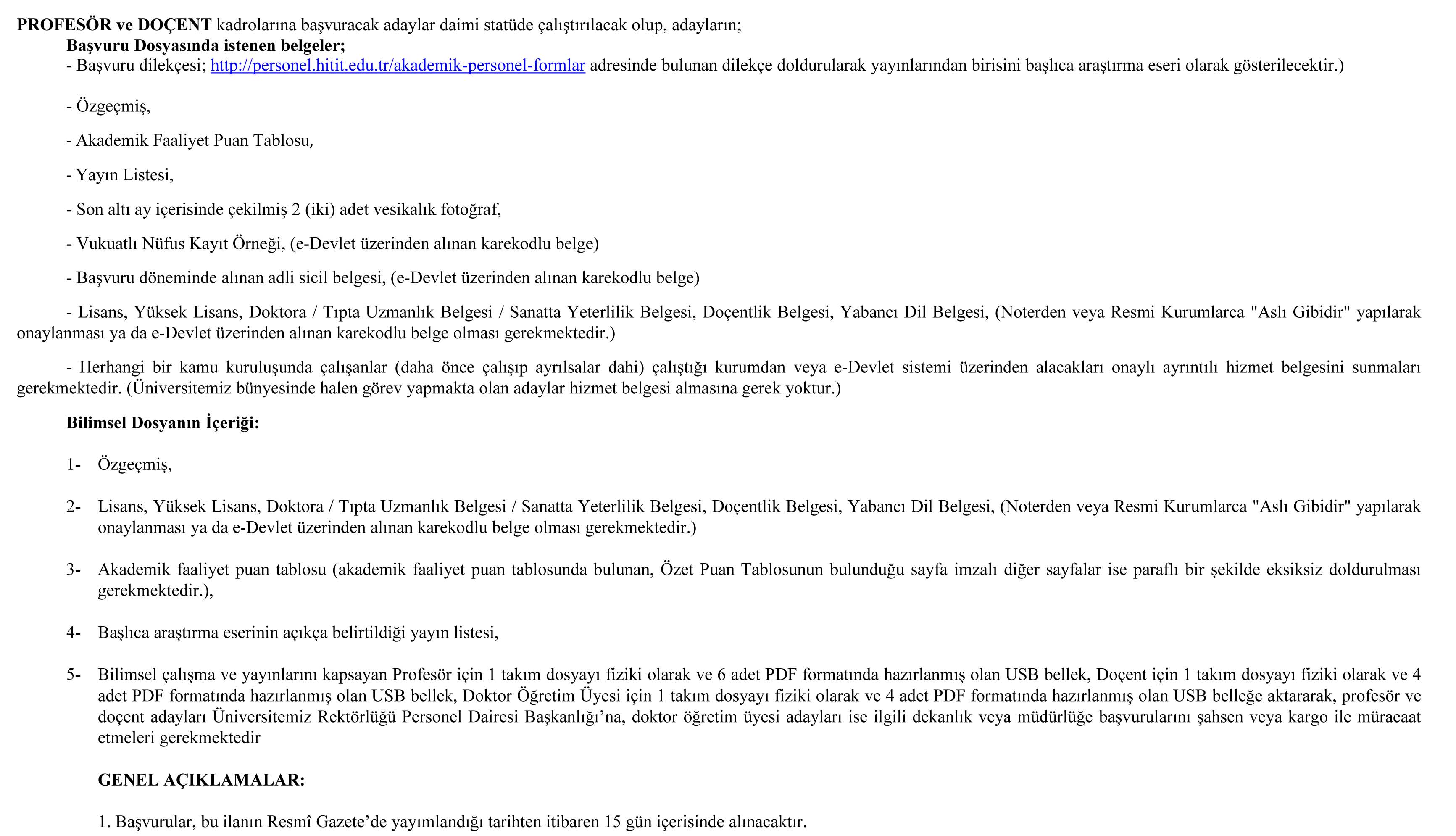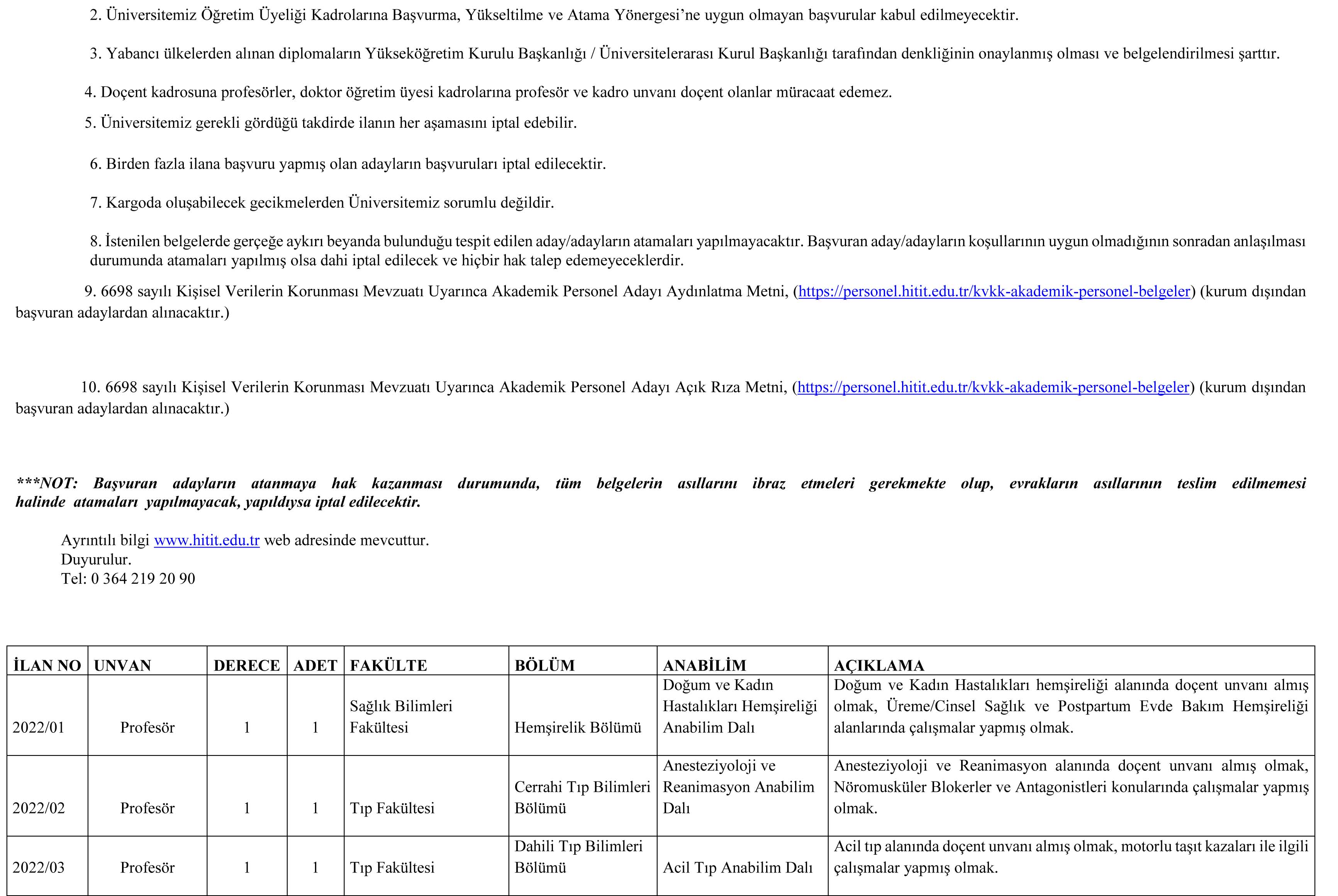 Üniversitemiz akademik birimlerine 657 sayılı Devlet Memurları Kanunu’nun 48. maddesi, 2547 sayılı Yükseköğretim Kanunu’nun 23. 24. ve 26. maddeleri, Öğretim Üyeliğine Yükseltilme ve Atanma Yönetmeliği’nin ilgili maddeleri ve Hitit Üniversitesi Öğretim Üyeliği Kadrolarına Başvurma, Yükseltilme ve Atama Yönergesi hükümleri çerçevesinde öğretim üyesi alınacaktır.