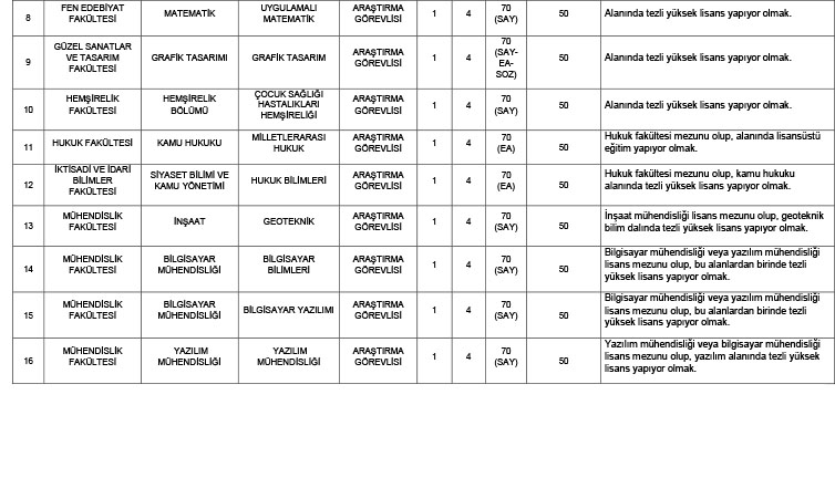 Üniversitemizin aşağıda belirtilen birimlerine; Öğretim Üyesi Dışındaki Öğretim Elemanı Kadrolarına Yapılacak Atamalarda Uygulanacak Merkezi Sınav ile Giriş Sınavlarına İlişkin Usul ve Esaslar Hakkında Yönetmelik, öğretim görevlisi kadrosuna başvuranlar 2547 sayılı Yükseköğretim Kanunu’nun 31. Maddesi, araştırma görevlisi kadrosuna başvuranlar 2547 sayılı kanunun 50/d maddesi kapsamında ve 657 sayılı Devlet Memurları Kanunu'nun 48. maddesi hükümleri uyarınca alınacaktır.