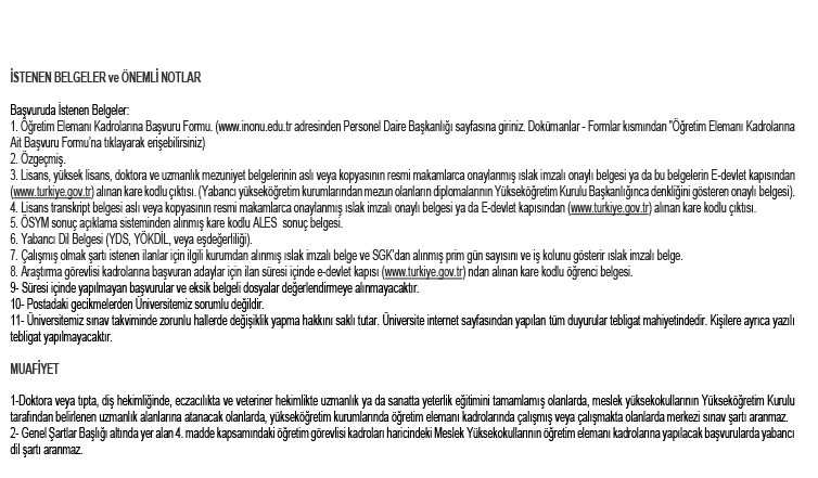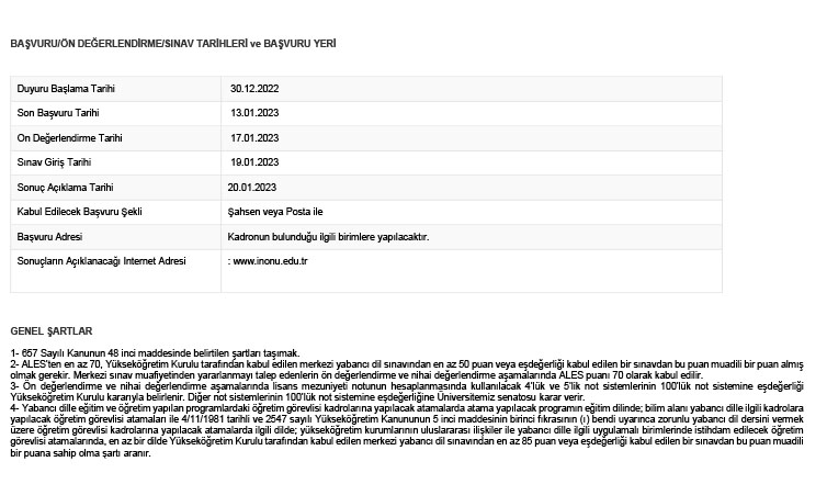 İlan olunur. Başvuru için gerekli belgeler ve ayrıntılı bilgi https://www.inonu.edu.tr/personeldb/ adresinde mevcuttur.