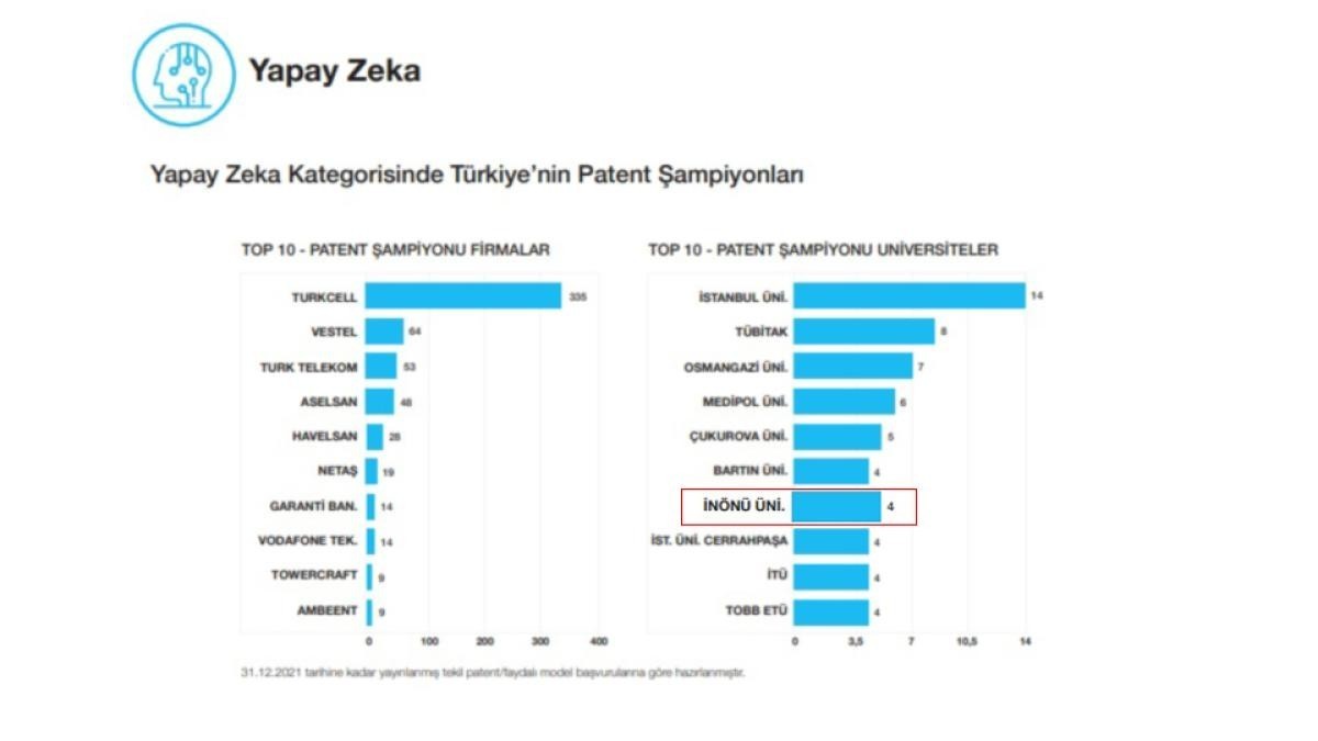 Rapora göre İnönü Üniversitesi teknoloji segmentinde dört ayrı kategoride patent şampiyonu üniversiteler arasında yer aldı. Kuruluşların 2021 yılına kadar olan tekil patent ve faydalı model başvuruları verilerine göre hazırlanan raporda, İnönü Üniversitesi teknoloji segmentinde Robotik Teknolojiler, Yapa Zeka, Batarya Teknolojileri ve Finans kategorilerinde Türkiye'nin Patent Şampiyonu Üniversiteleri arasına girdi. Her kategoride başvuru sayısına göre ilk 10 üniversite sıralanırken İnönü Üniversitesi Batarya Teknolojileri alanında üçüncü, Finans alanında altıncı, Yapay Zeka alanında yedinci ve Robotik Teknolojiler alanında ise onuncu oldu. Ayrıca sıralamalarda Türkiye'nin büyük ve köklü üniversiteleri ile araştırma merkezleri bulunurken teknoloji, iletişim, otomotiv gibi sektörlerde önde gelen markaların da olduğu görüldü.Bu sonuçlara göre İnönü Üniversitesinin son yıllarda özellikle teknoloji ve inovasyon yönetimi alanlarındaki çalışmaları ile üniversite-sanayi iş birliği anlayışı temelinde bilimsel projelerin faydalı model ve ürüne dönüştürülmesine ilişkin uygulamalarının sonuç verdiği anlaşıldı.