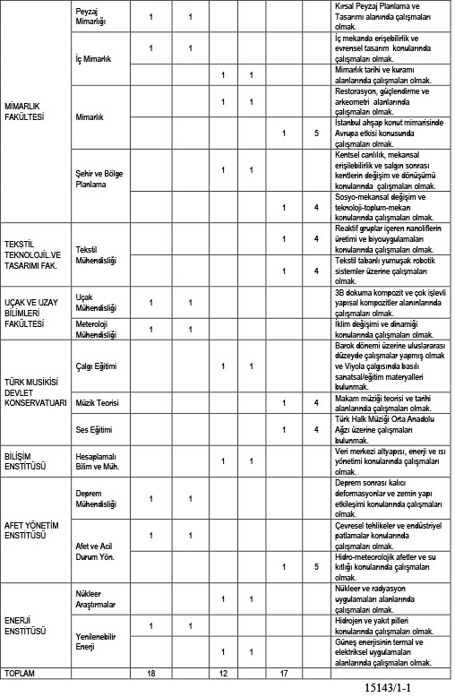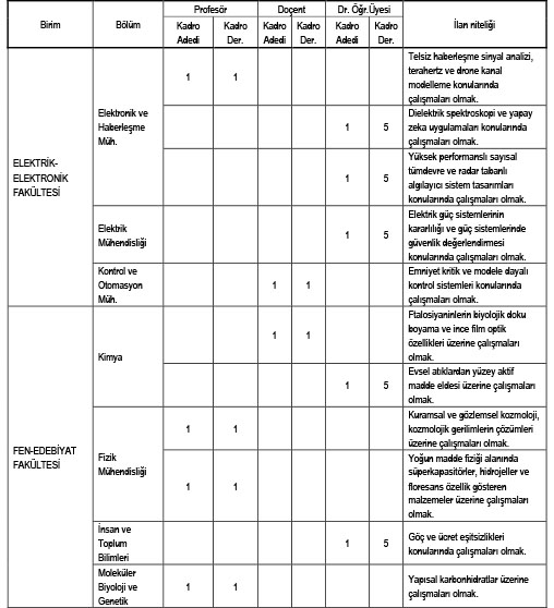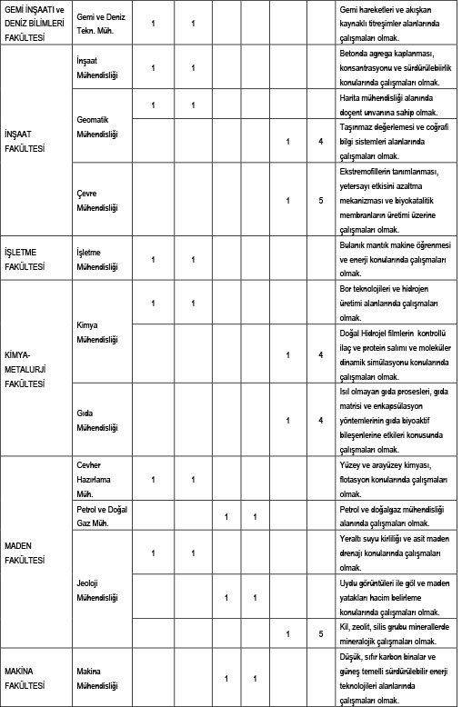 Üniversitemizin aşağıda belirtilen birimlerinde açık bulunan kadrolarına, 657 sayılı Kanunun 48. maddesindeki şartları sağlamak kaydıyla, 2547 sayılı Kanunun 23. 24. ve 26. maddeleri ile Öğretim Üyeliğine Yükseltilme ve Atanma Yönetmeliği ve İTÜ Akademik Yükseltme ve Atama Ölçütleri (2018) uyarınca Öğretim Üyeleri alınacaktır.