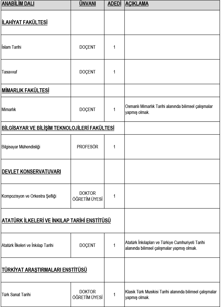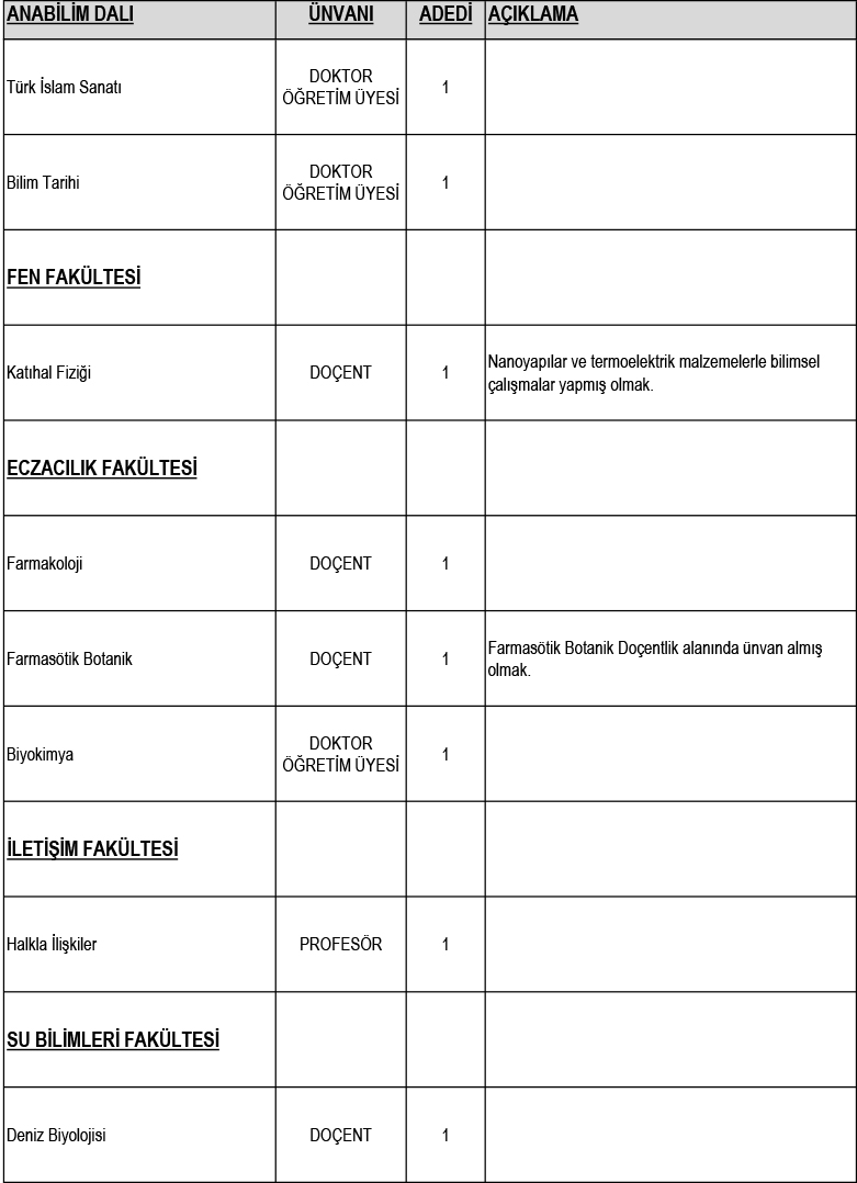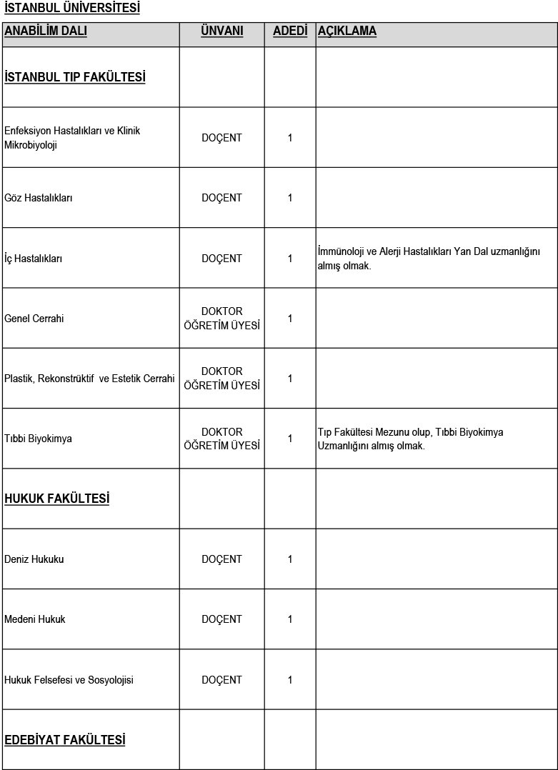 Üniversitemizin aşağıda isimleri yazılı birimlerine, 2547 Sayılı Kanunun ilgili maddeleri, 657 sayılı Devlet Memurları Kanunu’nun 48. maddesi, 12.06.2018 tarihli Resmi Gazete’de yayımlanarak yürürlüğe giren “Öğretim Üyeliğine Yükseltilme ve Atanma Yönetmeliği”nin ilgili maddeleri ve Yükseköğretim Kurulu Başkanlığınca onaylanan “İstanbul Üniversitesi Akademik Yükseltilme ve Atama Kriterleri” uyarınca Profesör, Doçent ve Doktor Öğretim Üyesi kadrolarına şahsen veya posta yoluyla eleman alınacaktır.