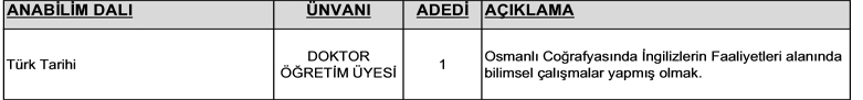7. 2547 sayılı Kanunun Ek 38. maddesi uyarınca (2547 Sayılı Kanunun 50. maddesinin birinci fıkrasının (d) bendi kapsamında istihdam edilerek doktora veya sanatta yeterlik eğitimlerini üniversitemizde tamamlayanların başvuru hakkı bulunmamaktadır.) belirlenen %30’lik kota kapsamında başvuru yapılabilecek Doktor Öğretim Üyesi kadrosu bulunmamaktadır.