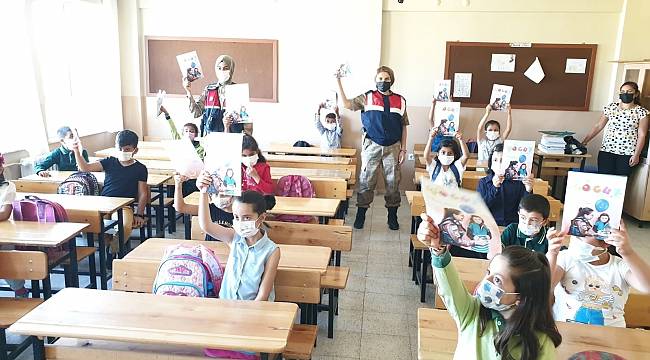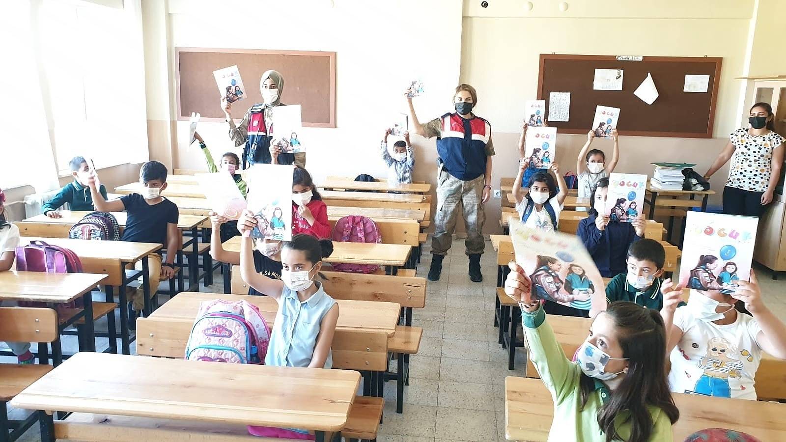 Malatya İl Jandarma Komutanlığı Aile İçi Şiddetle Mücadele ve Çocuk Kısım Amirliği görevlileri, yüz yüze eğitimin açılmasıyla birlikte eğitim gören öğrencilere boyama kitabı, kalem, broşür hediye ettiler.