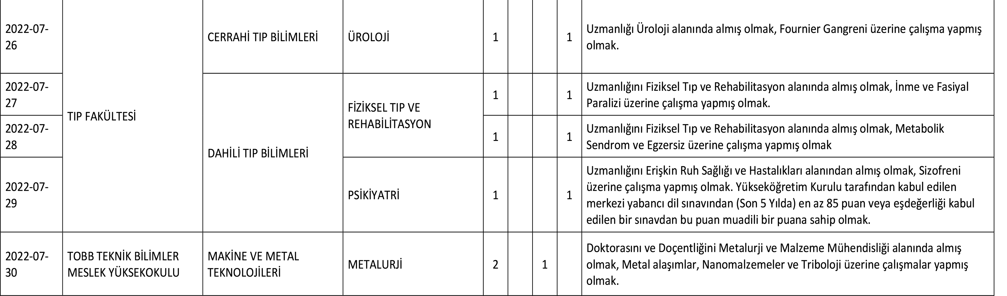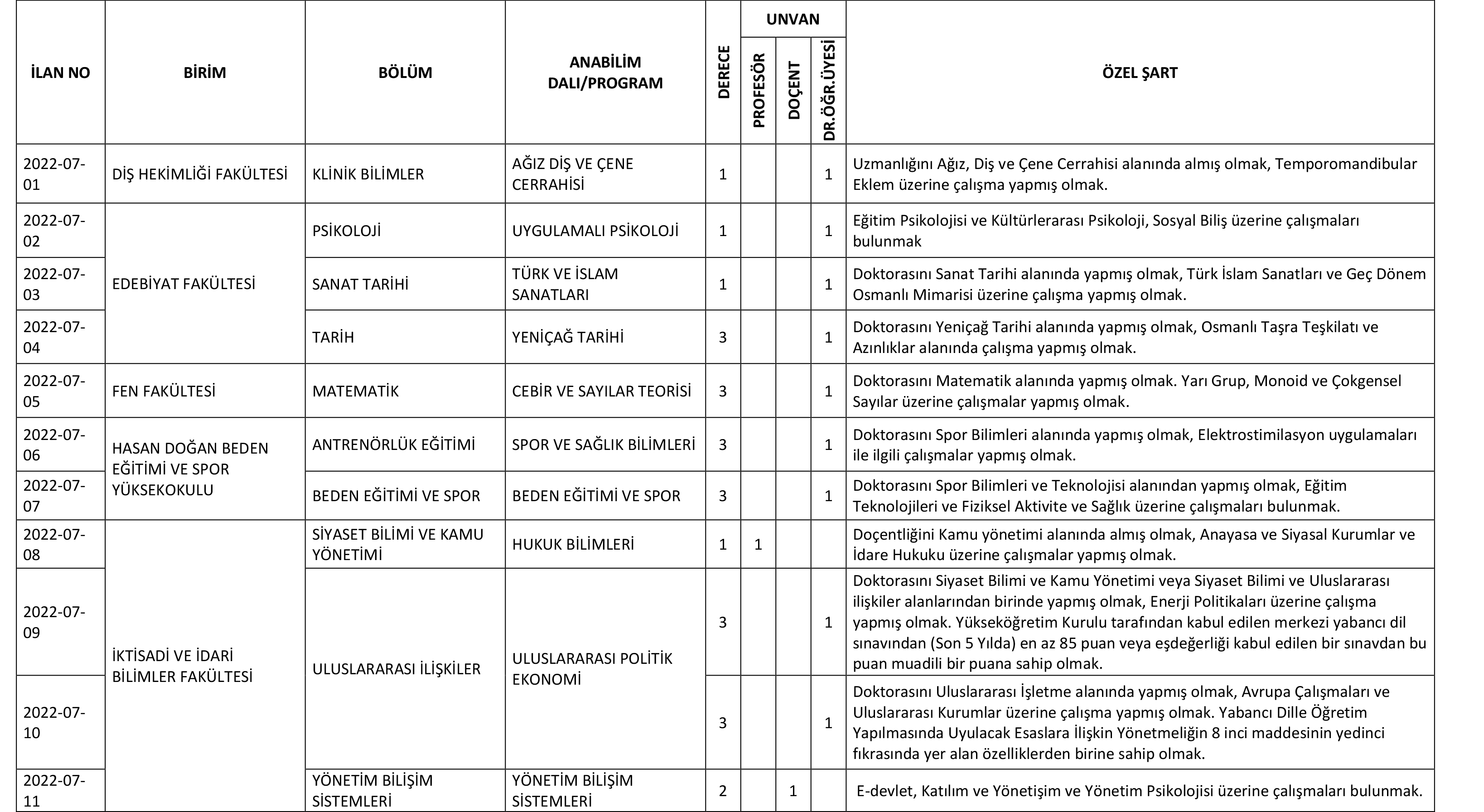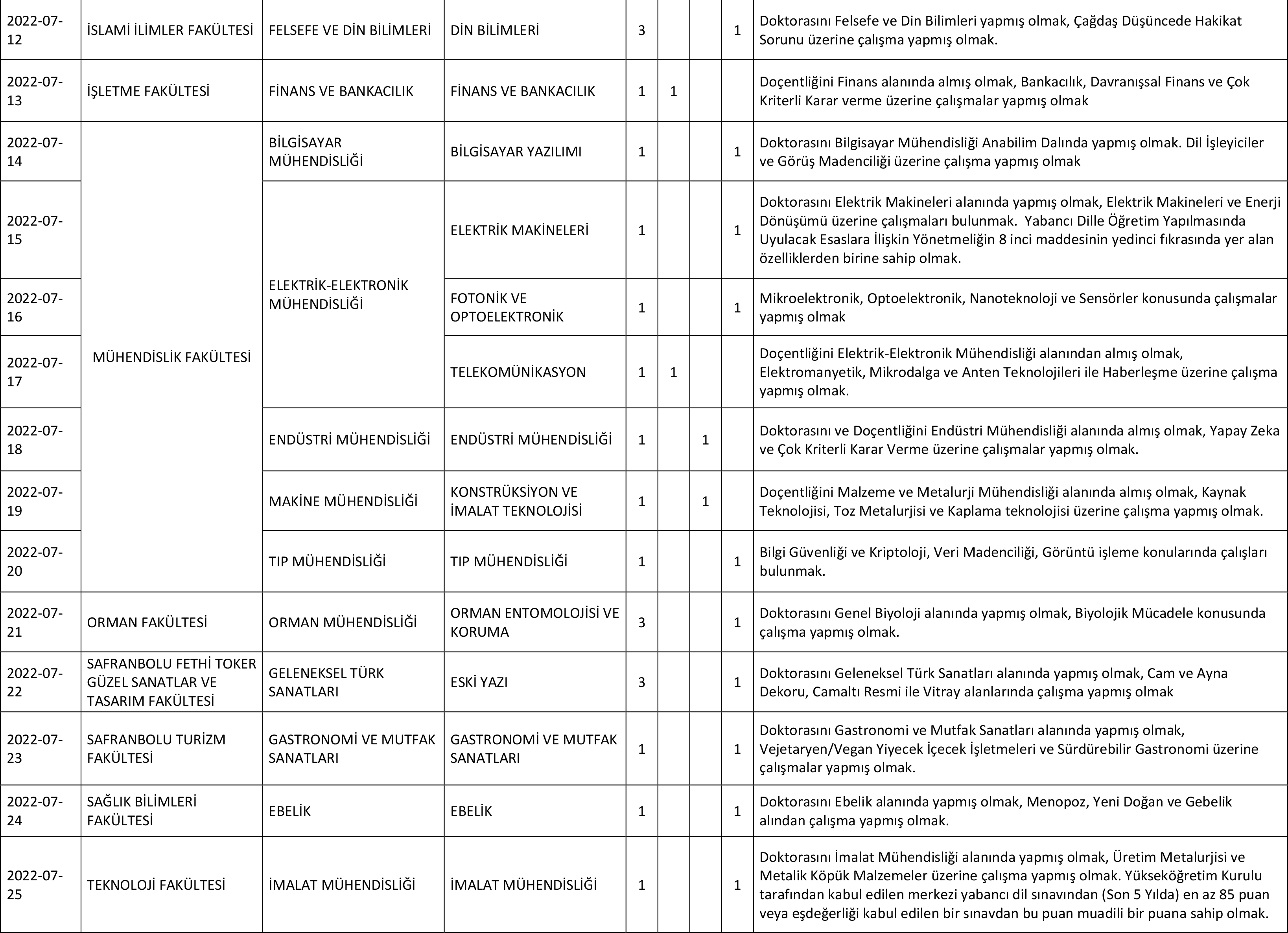Üniversitemizin aşağıda belirtilen birimlerine, 2547 sayılı Yükseköğretim Kanunu'nun ve Öğretim Üyeliğine Yükseltilme ve Atanma Yönetmeliği'nin ilgili maddeleri, Yükseköğretim Kurulu Başkanlığının web sayfasında yayımlanarak yürürlüğe giren “T.C. Karabük Üniversitesi Öğretim Üyeliğine Yükseltilme ve Atanma Esasları” ile 657 sayılı Devlet Memurları Kanunu’nun 48. maddesinde belirtilen şartları sağlamış olmak koşulu ile öğretim üyesi alınacaktır.