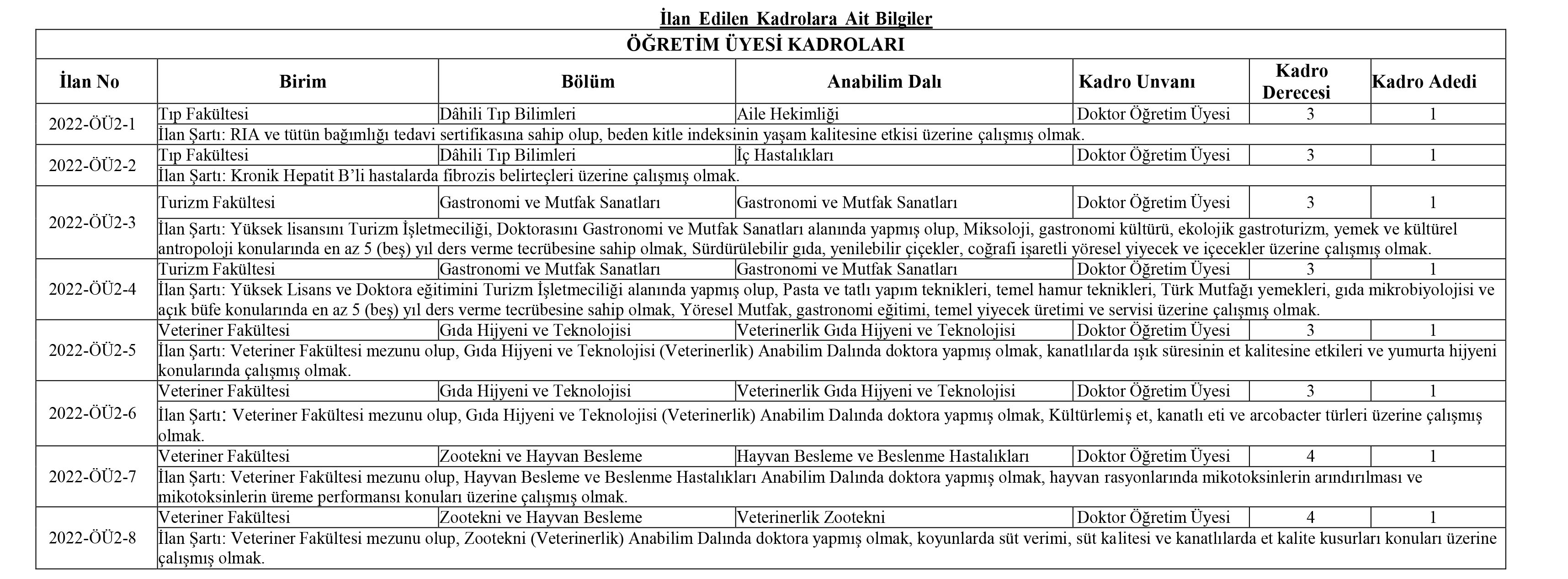 Üniversitemizin aşağıda yazılı birimlerine 657 sayılı Kanun, 2547 sayılı Kanun, Öğretim Üyeliğine Yükseltilme ve Atanma Yönetmeliği, Üniversitemizin Öğretim Üyeliğine Yükseltilme ve Atanma Esasları Yönergesi(1)’ nin ilgili hükümleri gereğince öğretim elemanı alınacaktır.