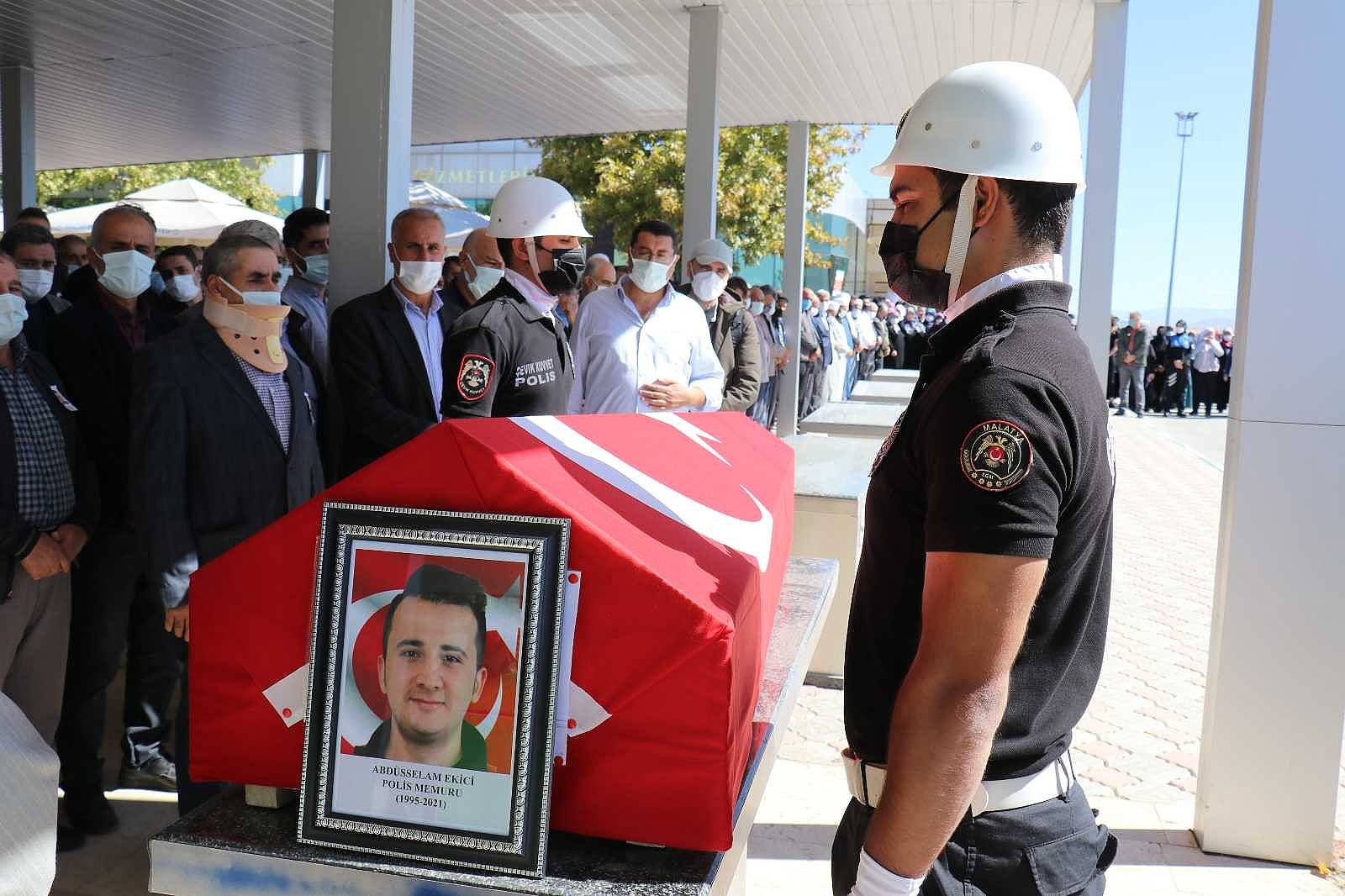 Geçtiğimiz gün, Kale ilçesinde meydana gelen trafik kazasında 44 LF 651 plakalı Chevrolet marka araç karşı şeride geçerek, 01 YV 976 plakalı Fiat marka otomobil ile 07 E 6129 plakalı Opel marka hafif ticari araca çarpmıştı. Feci kazada, Diyarbakır'da görevli polis memuru Abdusselam Ekici (26), babası Şerif Ekici (50) ile birlikte 5 kişi hayatını kaybetmişti. Kazada ölen polis memuru Ekici ve babası için Malatya Şehir Mezarlığı'nda cenaze namazı kılındı. Cenazeye Malatya İl Emniyet Müdürü Ercan Dağdeviren, emniyet personeli, çok sayıda vatandaş katıldı. Polis memuru Abdusselam Ekici'nin eşi Kübra Ekici, cenazeye sağlık ekiplerinin gözetiminde sedye ile katıldı. Kılınan cenaze namazının ardından polis memuru ve babası toprağa verildi.