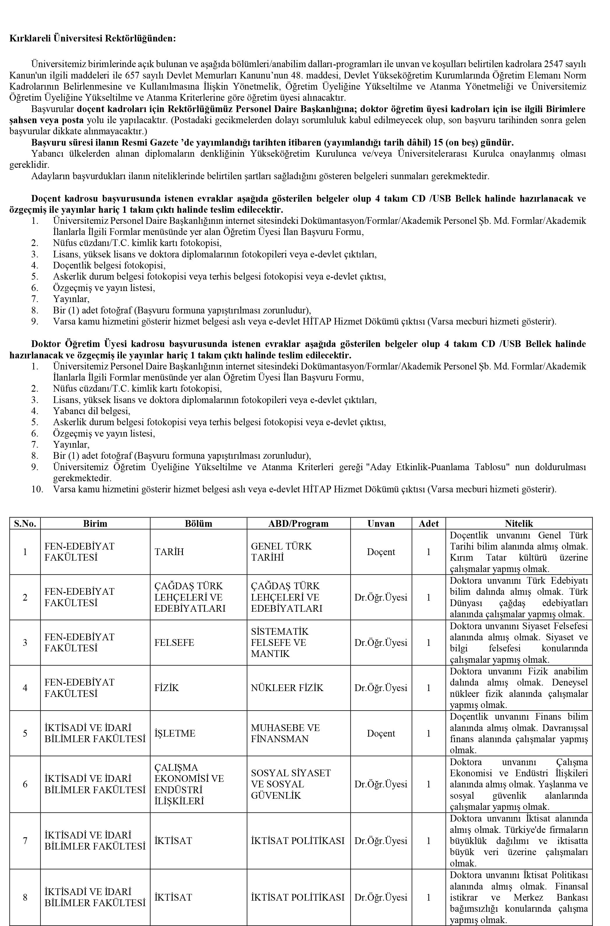 Başvurular doçent kadroları için Rektörlüğümüz Personel Daire Başkanlığına; doktor öğretim üyesi kadroları için ise ilgili Birimlere şahsen veya posta yolu ile yapılacaktır.
