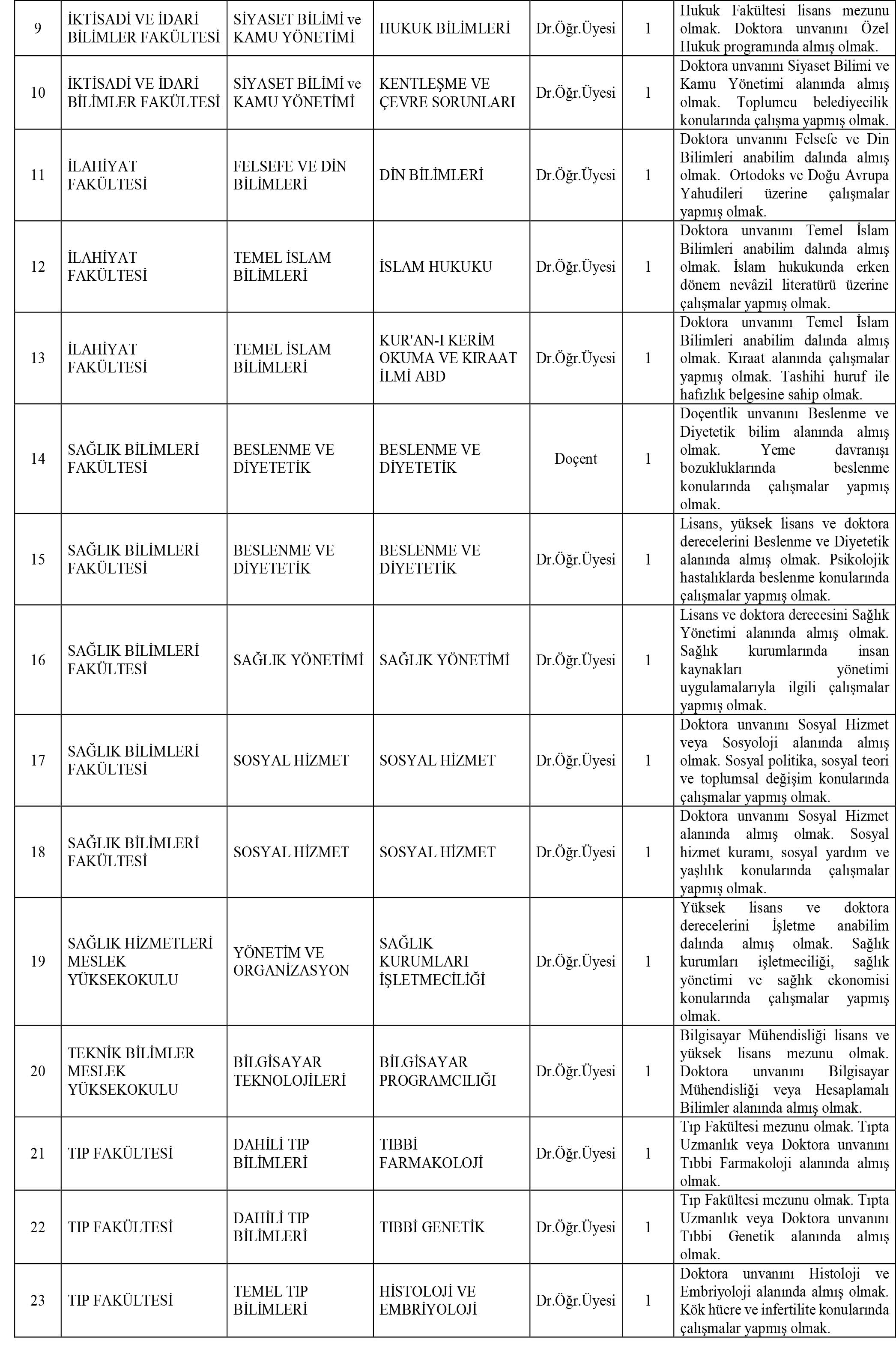 Üniversitemiz birimlerinde açık bulunan ve aşağıda bölümleri/anabilim dalları-programları ile unvan ve koşulları belirtilen kadrolara 2547 sayılı Kanun'un ilgili maddeleri ile 657 sayılı Devlet Memurları Kanunu’nun 48. maddesi, Devlet Yükseköğretim Kurumlarında Öğretim Elemanı Norm Kadrolarının Belirlenmesine ve Kullanılmasına İlişkin Yönetmelik, Öğretim Üyeliğine Yükseltilme ve Atanma Yönetmeliği ve Üniversitemiz Öğretim Üyeliğine Yükseltilme ve Atanma Kriterlerine göre öğretim üyesi alınacaktır.