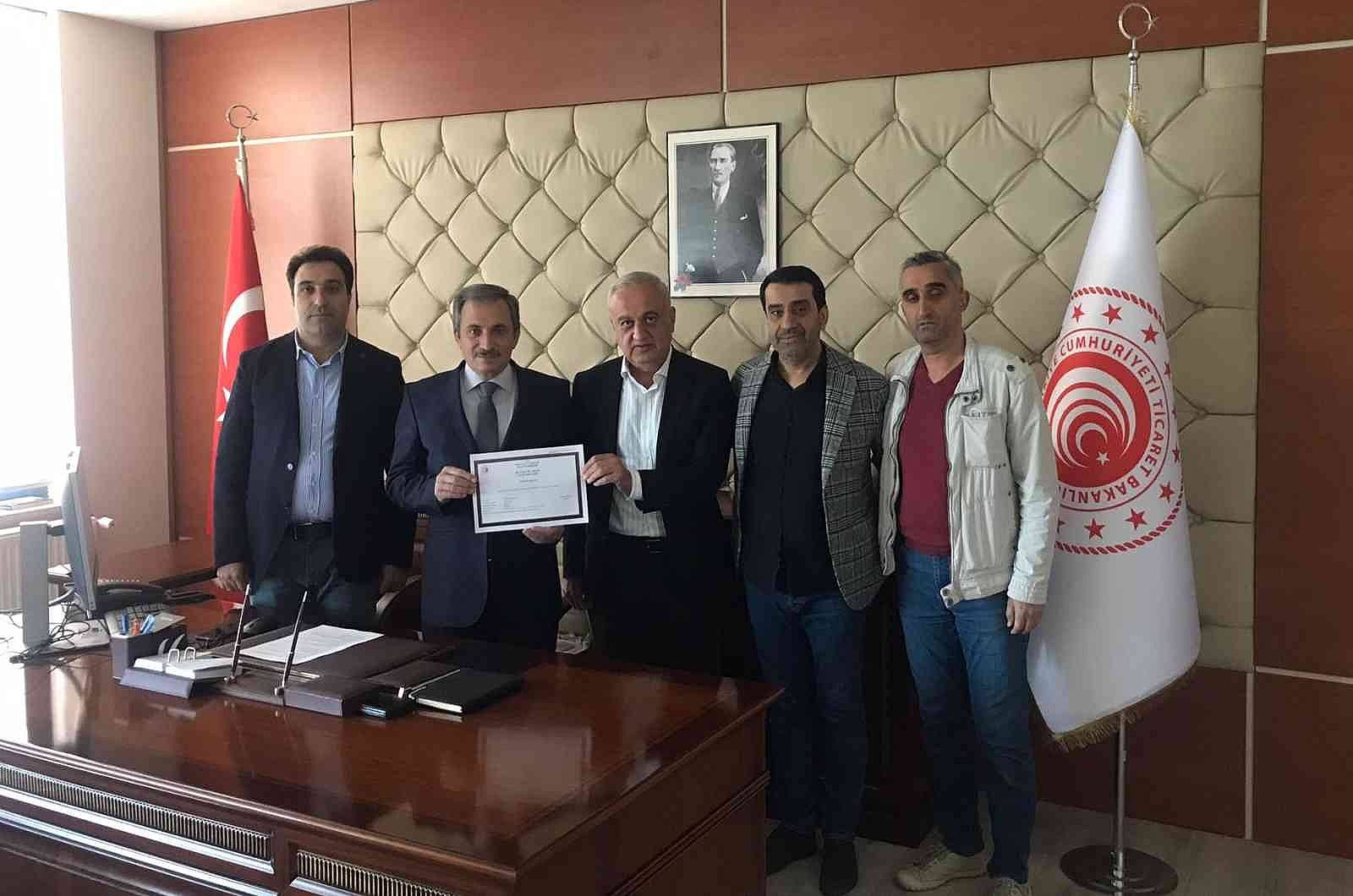 Malatya Ticaret İl Müdürü Ahmet Demirbağ, Malatya'da 1 Nolu Kuyumcu Yetki Belgesini Malatya Kuyumcular Odası Başkanı Murat Özhüsrev'e verdi.