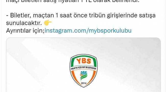 TFF 3. Lig 2. Grup'ta mücadele eden Malatya Yeşilyurt Belediyespor'da 4. hafta müsabakası Beyoğlu Yeni Çarşı FK maçında bilet fiyatı 1 TL olarak açıklandı.