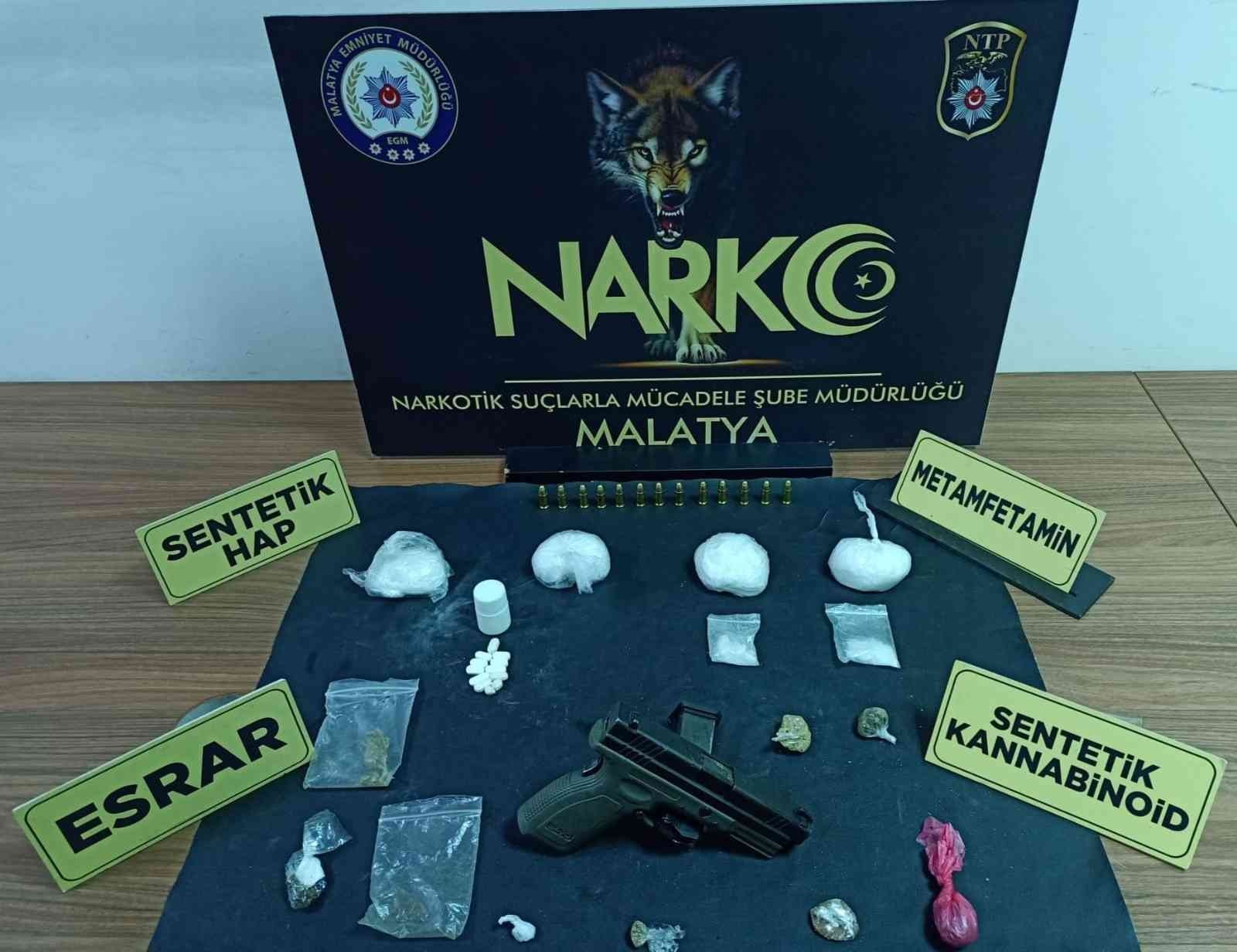 Malatya uyuşturucu ile mücadele kapsamında çalışmalarını aralıksız sürdüren polis ekipleri Malatya- Elazığ karayolu Kale yol uygulama noktasında şüphe üzerine durdurulan bir araçta arama yaptı. Yapılan aramada torpido kısmında özel düzenekle açılan zulalı bölmede 185 gram metamfetamin, 17 gram esrar , 11 adet uyuşturucu hap, 1 adet ruhsatsız tabanca ile 13 adet fişek ele geçirildi.