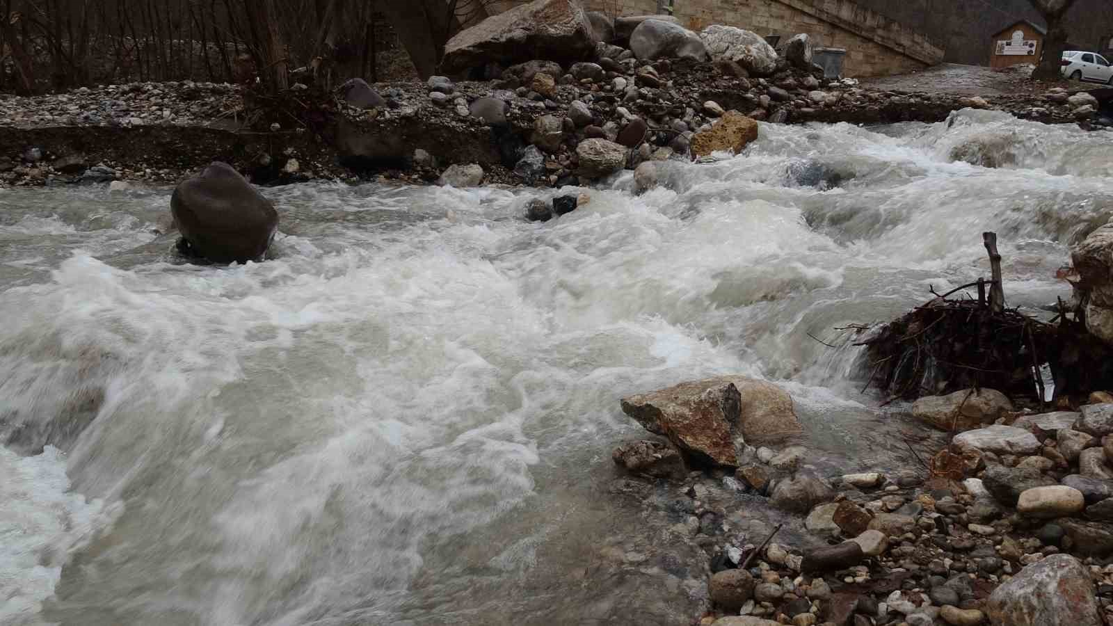 Malatya'nın Arapgir ilçesinde etkili olan sağanak ve kar yağışı, Kozluk Çayı'nın taşmasına neden oldu.