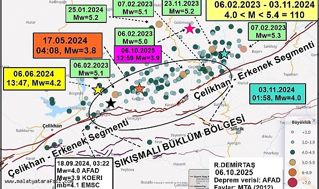 “06 Şubat 2023 ile 03 Kasım 2024 arasında bu sıkışmalı büklüm bölgesinde 4.0 ile 5.4 aralığında toplam 110 deprem oldu. Bugünkü depremin hemen yakınında 07.02.2023’te 5.3 ve 23.11.2023’te 5.2 büyüklüğünde iki orta büyüklükte deprem meydana geldi.”