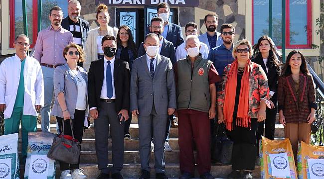Hayvan barınağı gezen Başkan Demez ve avukatlar hayvanları severek onlara mama yardımında bulunuldu.