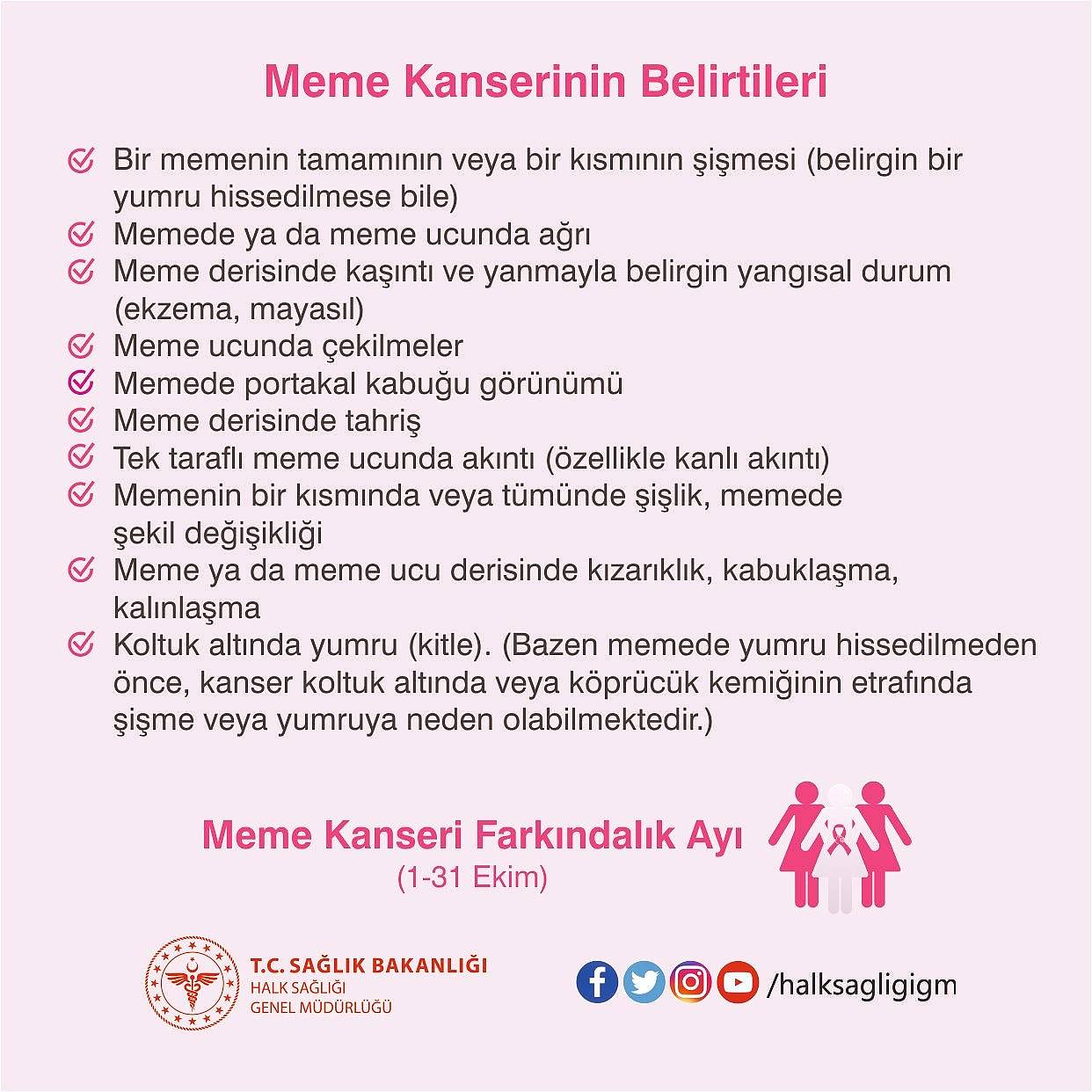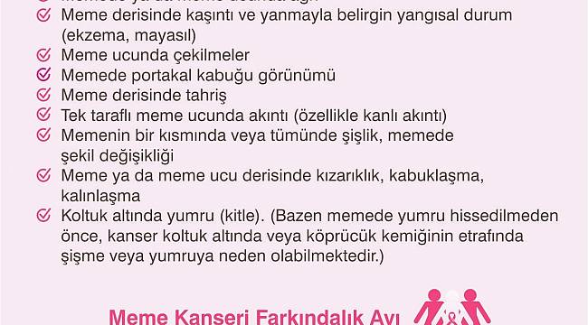 Kadınların korkulu rüyası olan meme kanserinin belirtileri konusunda yapılan açıklamada ise kitlenin önemine dikkat çekilip, "Meme kanserinin en sık rastlanan belirtisi, memede ağrısız, zamanla büyüyen bir yumrunun (kitlenin) ele gelmesi, hissedilmesidir. Ayrıca ele gelen yumru (kitle) olsa da olmasa da aşağıdaki belirtiler de meme kanserinde görülebilmektedir. Memede ya da meme ucunda ağrı, Meme derisinde kaşıntı ve yanmayla belirgin yangısal durum (ekzema, mayasıl), meme ucunda çekilmeler, Memede portakal kabuğu görünümü, Meme derisinde tahriş, Tek taraflı meme ucunda akıntı- özellikle kanlı akıntı, Koltuk altında yumru (kitle), Memenin bir kısmında veya tümünde şişlik, memede şekil değişikliği, Meme ya da meme ucu derisinde kızarıklık, kabuklaşma, kalınlaşma şeklinde ortaya çıkar" denilerek, bunlara karşı dikkatli olunması istendi.