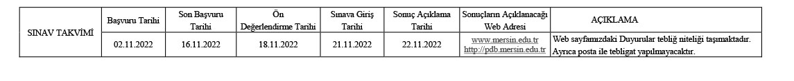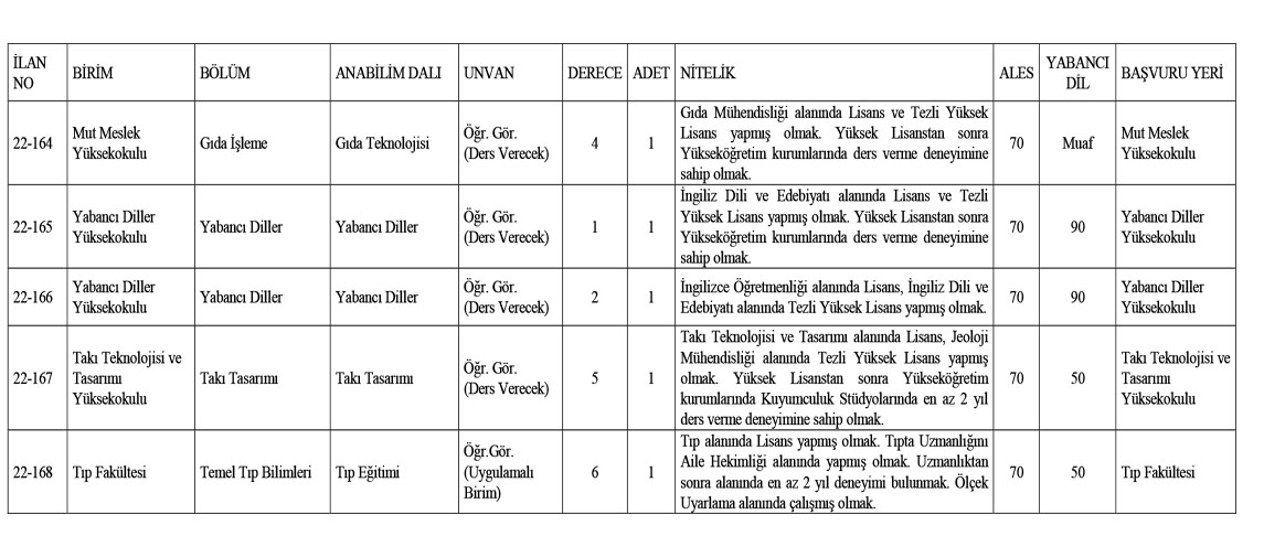Mersin Üniversitesi Rektörlüğünden: - Üniversitemizin aşağıda isimleri yazılı birimlerine, 2547 sayılı Yükseköğretim Kanunu'nun ve "Öğretim Üyesi Dışındaki Öğretim Elemanı Kadrolarına Yapılacak Atamalarda Uygulanacak Merkezi Sınav ile Giriş Sınavlarına İlişkin Usul ve Esaslar Hakkında Yönetmelik"in ilgili maddelerine göre Öğretim Görevlisi ve Araştırma Görevlisi alınacaktır.