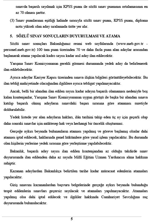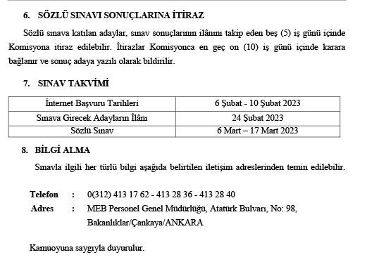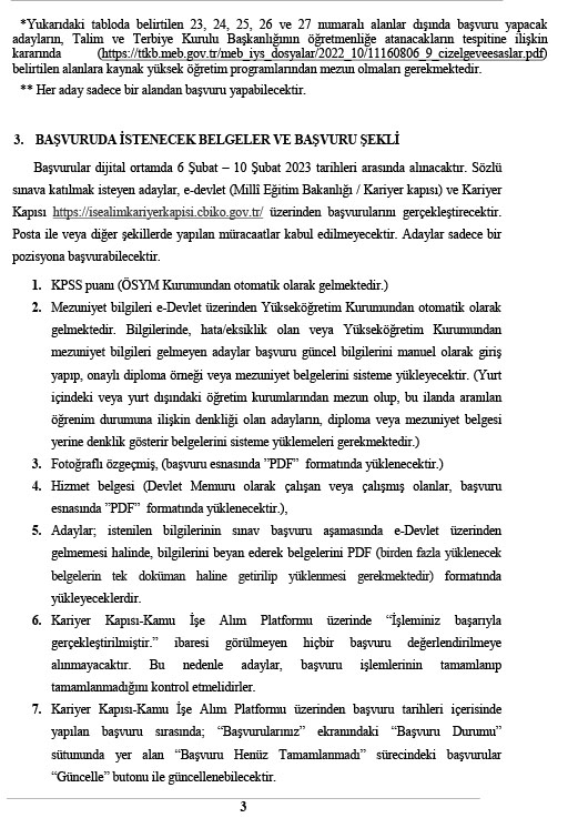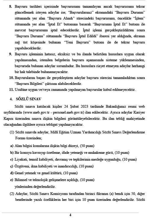 1. GENEL BİLGİLER Millî Eğitim Bakanlığında 9 uncu derece kadroda görev yapmak üzere 50 (elli) Millî Eğitim Uzman Yardımcısı alınacaktır. Millî Eğitim Uzman Yardımcılığı için aranılan şartları taşıyan adayların başvuruları 6 Şubat – 10 Şubat 2023 tarihleri arasında Cumhurbaşkanlığı İnsan Kaynakları Ofisi Kariyer Kapısı İşe Alım Platformu üzerinden elektronik ortamda alınacaktır. 2023 Millî Eğitim Uzman Yardımcılığı Yarışma Sınavı sözlü sınav olarak 6 Mart – 17 Mart 2023 tarihlerinde Ankara’da yapılacaktır. Sözlü Sınavına, alanlar itibariyle ilan edilen Millî Eğitim Uzman Yardımcısı kadro kontenjanı için öngörülen sayıda başvurunun olmaması halinde veya kadro sayısınca adayın başarılı olamaması halinde kadro ve ihtiyaç durumuna göre alanlar arasında sayısal belirleme ve değişiklik yapma yetkisi Bakanlığa aittir. Sözlü sınava katılmaya hak kazanan adaylar 24 Şubat 2023 tarihinde www.meb.gov.tr - personel.meb.gov.tr adreslerinde yayınlanacaktır. Ayrıca adaylar Kariyer Kapısı üzerinden sınava ilişkin bilgileri görüntüleyebilecektir. Sözlü sınava katılma şartlarını taşıyan ve usulüne uygun olarak başvuru yapanlardan, aşağıda belirtilen alanlar ve puan türleri itibariyle belirlenen taban puanı almış olmak kaydıyla kadro sayısının 3 (üç) katı aday sözlü sınava çağrılır. Son sıradaki adayla eşit puan almış adaylar da sözlü sınava çağrılır. RESMİ İLAN METNİ İÇİN TIKLAYINIZ 2. BAŞVURU ŞARTLARI Millî Eğitim Uzman Yardımcılığı sözlü sınavına katılabilmek için adayların aşağıdaki şartları taşıması gerekmektedir: a) 657 sayılı Devlet Memurları Kanununun 48 inci maddesinin birinci fıkrasının (A) bendinde yer alan genel şartları taşımak, b) Üniversitelerin en az dört yıllık lisans eğitimi veren ve aşağıda tabloda belirtilen öğrenim dallarından birinden veya bunlara denkliği Yükseköğretim Kurulu tarafından kabul edilen yurtiçindeki veya yurtdışındaki öğretim kurumlarından mezun olmak, (Adayların, yukarıda belirtilen bölümlere denk sayılan bölümlerden mezun olmaları halinde YÖK tarafından onaylanmış denklik belgelerini e-Devlet ile başvuru aşamasında eklemeleri gerekmektedir.),