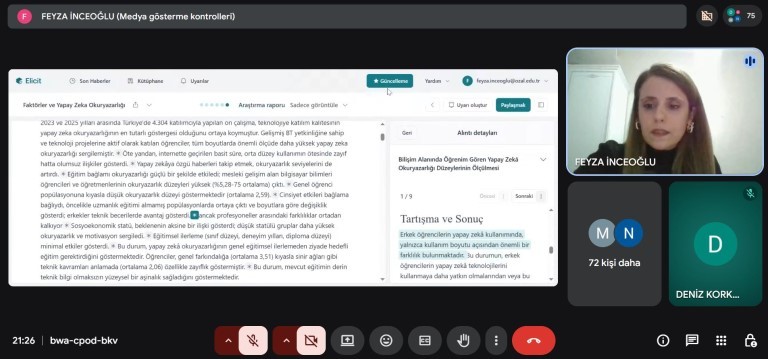 Malatya Turgut Özal Üniversitesi Tıp Fakültesi Biyoistatistik Anabilim Dalı Öğretim Üyesi Doç. Dr. Feyza İnceoğlu tarafından gerçekleştirilen etkinlikte, yapay zeka teknolojilerinin bilimsel araştırma süreçlerindeki rolü, veri analizi ve modelleme aşamalarında sunduğu imkanlar, literatür tarama ve akademik yazım süreçlerine katkıları ile etik ve akademik sorumluluk boyutları hakkında kapsamlı bilgi ve değerlendirmeler paylaşıldı.