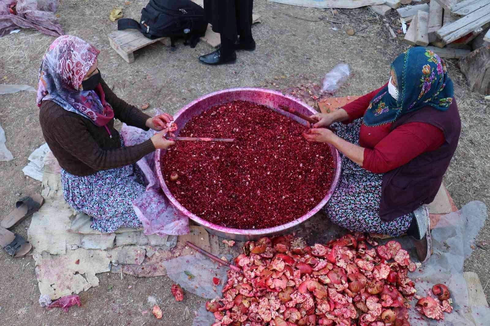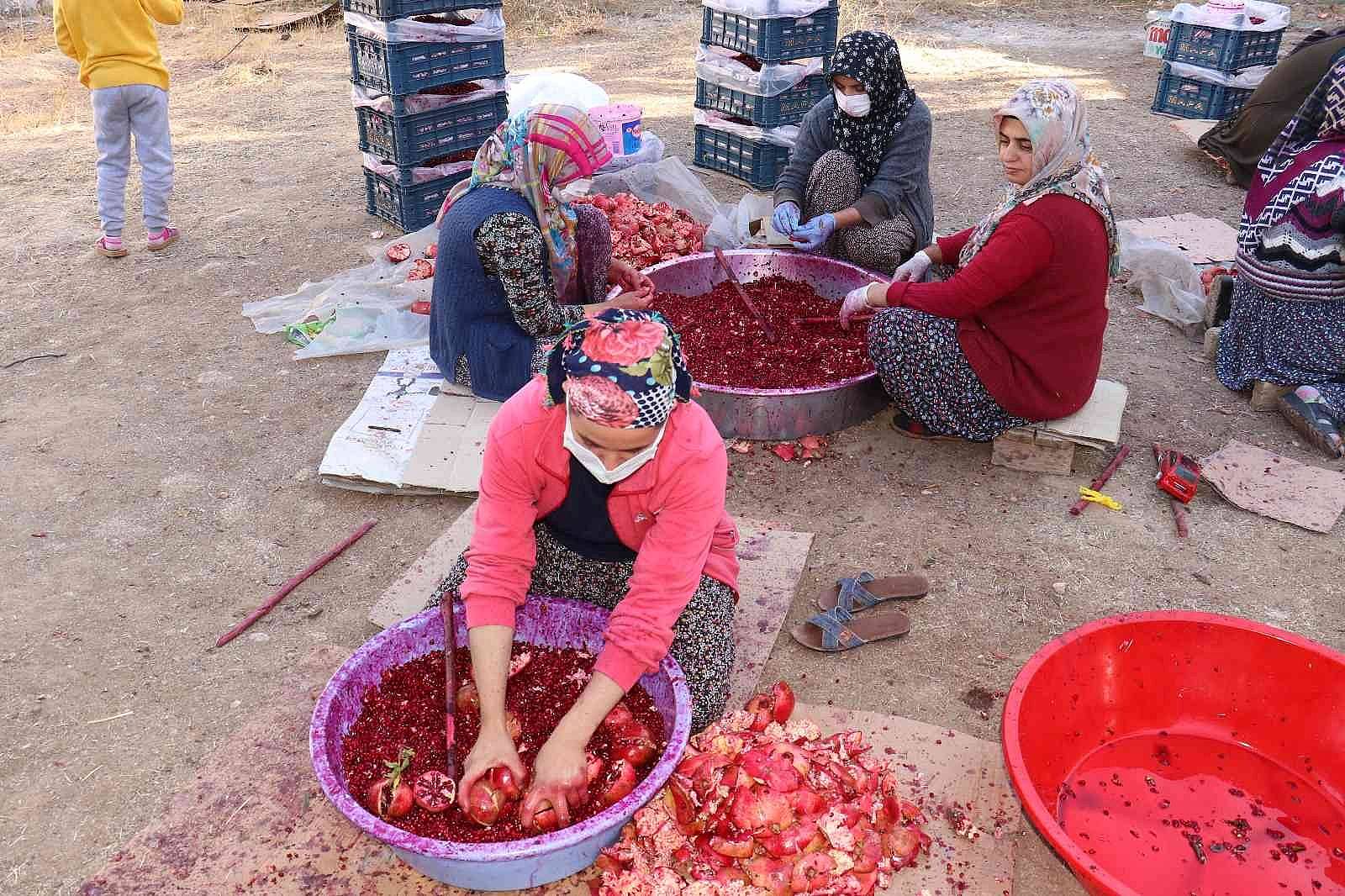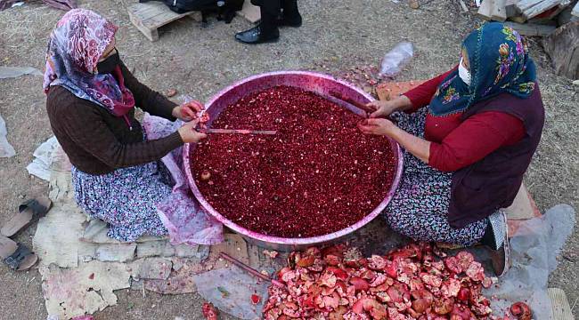 Arkadaşlarıyla birlikte mutlu bir şekilde nar ayıkladıklarını belirten Fatma Bayram, "Akrabamız narları dışarıdan toplamış getirmiş. Biz burada yevmiyeci olarak çalışıyoruz. Bunlar fabrikaya götürülecek nar eksisi yapılacak. Mahallece geldik yapıyoruz. Hem evimize biraz katkıda bulunuyoruz hem de arkadaşlarla güle oynaya şakalara yapıyoruz" şeklinde konuştu.