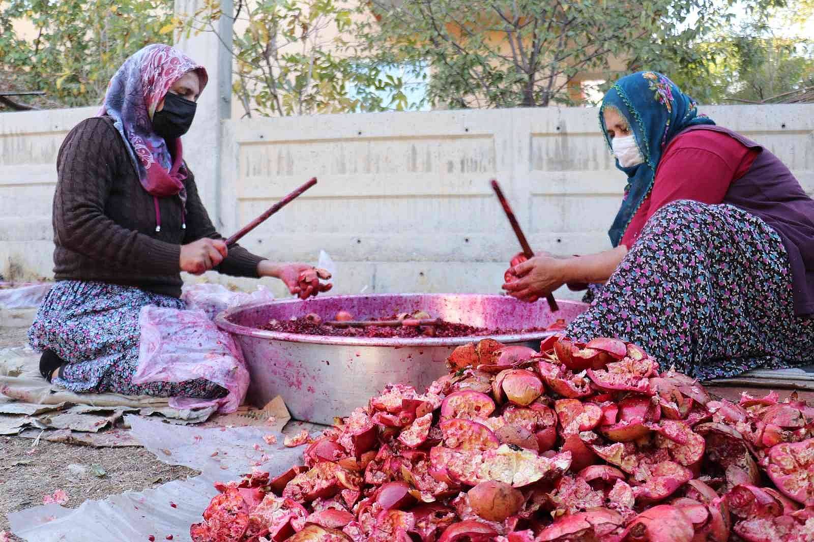 Tadıyla ve aromasıyla sofraların vazgeçilmezi olan nar ekşisi, Malatya'da kadınların elinden zahmetli yolculuğun ardından sofralardaki yerini alıyor. Malatya'nın Yeşilyurt ilçesine bağlı Hoca Ahmet Yesevi Mahallesinde ev kadınları, narların taneleri tek tek ayırırken hem eğleniyor hem de aile bütçelerine katkı sağlıyorlar. Yazıhan ilçesinden getirilen narlar, burada sopa ile tanelerinden ayıklanıyor ve fabrikaya gönderiliyor. Yapılan işlemde tanelerden nar ekşisi yapılan narın kabuğundan da çay yapılıyor.