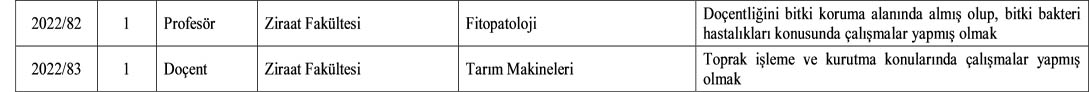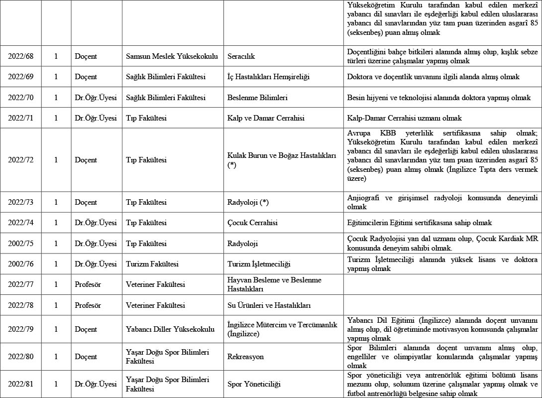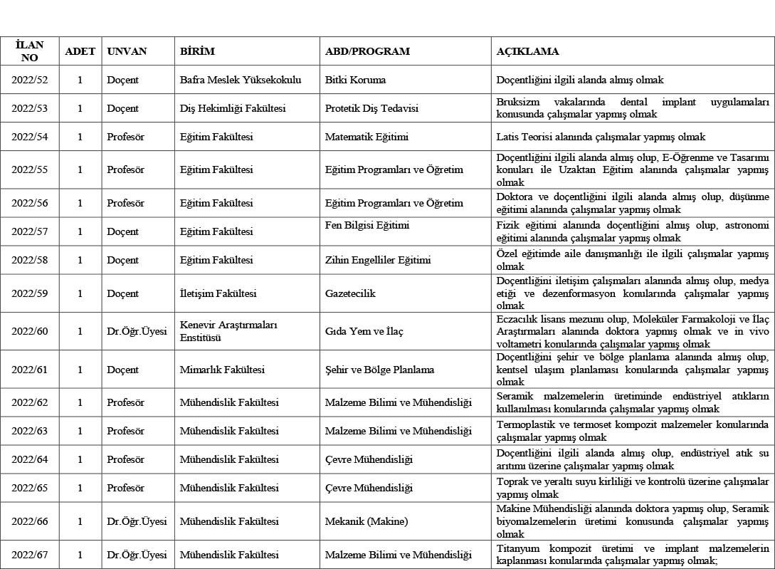 Üniversitemize 2547 sayılı Kanun Hükümlerine göre Öğretim Üyesi alınacaktır. Adayların 657 sayılı Kanunun 48. maddesinde ve diğer ilgili mevzuatlardaki şartları taşımaları gerekmektedir.