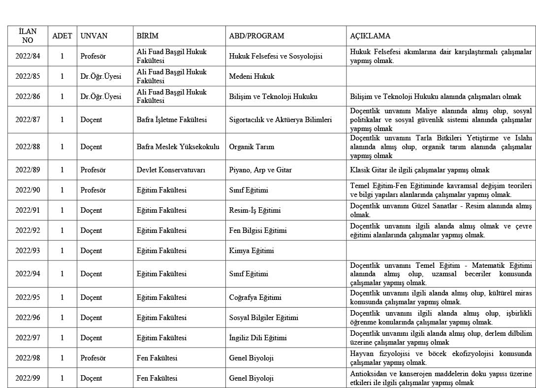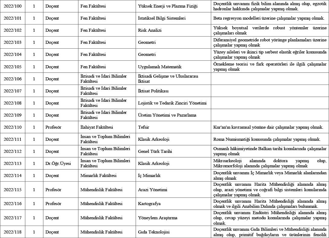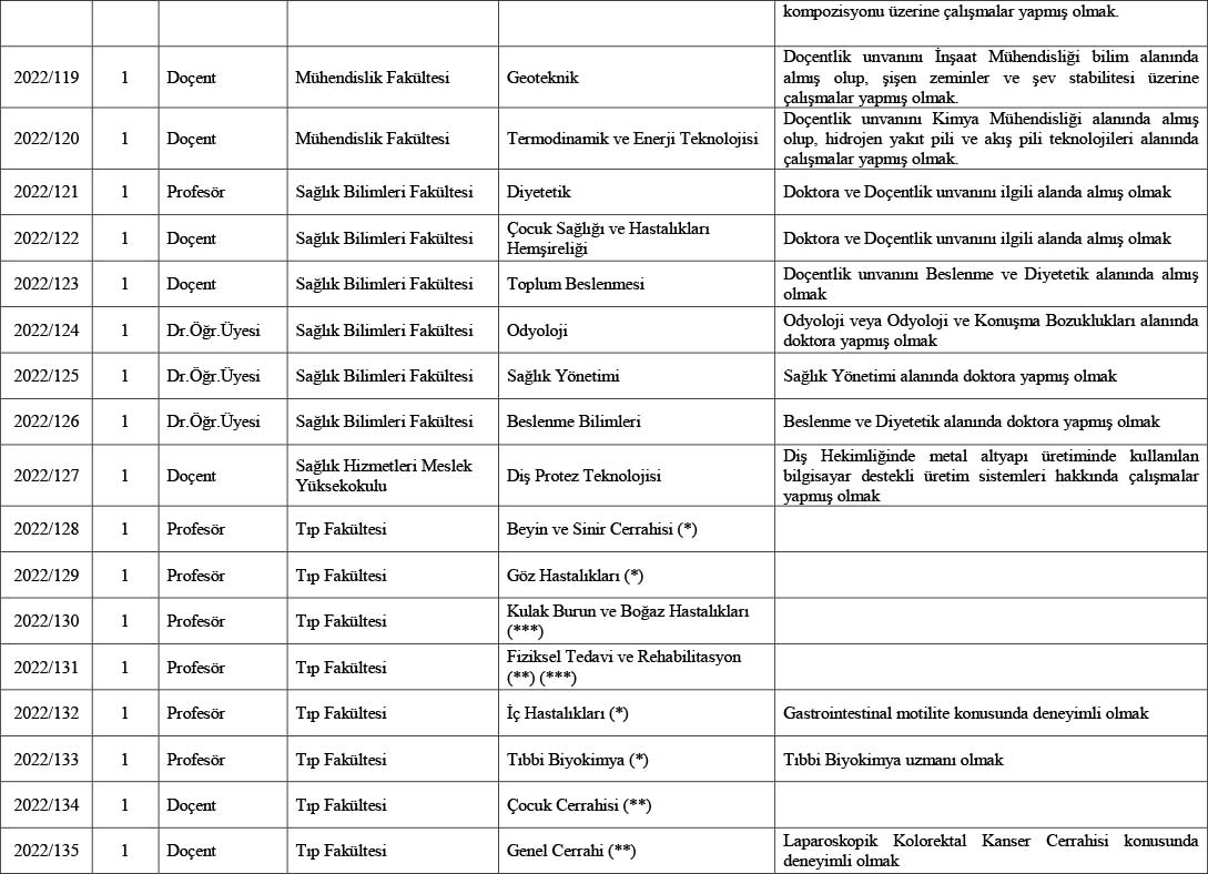 Üniversitemize 2547 sayılı Kanun Hükümlerine göre Öğretim Üyesi alınacaktır. Adayların 657 sayılı Kanunun 48. maddesinde ve diğer ilgili mevzuatlardaki şartları taşımaları gerekmektedir.