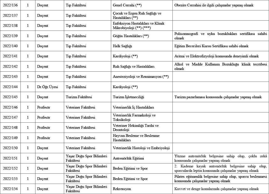 (**) Adayların Tıp Fakültesi için eğitici eğitim sertifikasına sahip olması gerekmektedir.