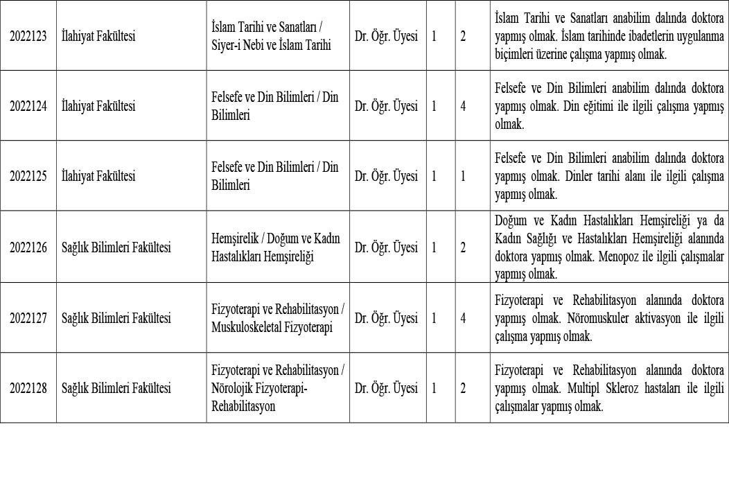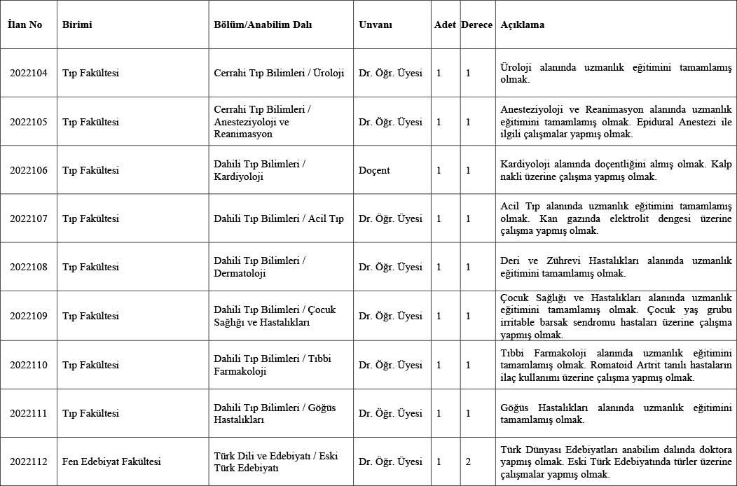 *Tıp Fakültesi kadrolarına başvuruda bulunacak adaylardan, halen Sağlık Bakanlığında görev yapanların uzmanlık belgelerini sunmak kaydıyla mecburi hizmet yükümlülüklerinin en geç üç ay içinde bitireceklerini belgelendirmeleri zorunludur. *Süresi içinde yapılmayan başvurular ile eksik belgeli dosyalar dikkate alınmayacaktır. Postadaki gecikmelerden kurumumuz sorumlu değildir.